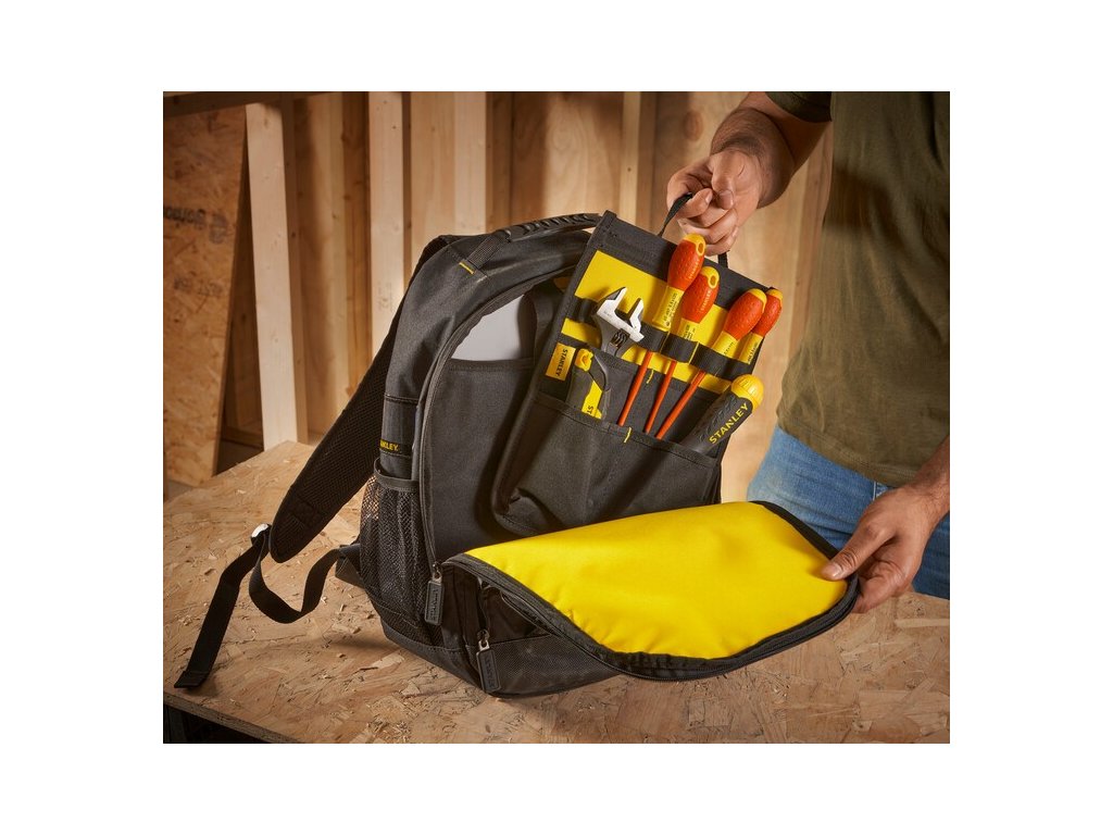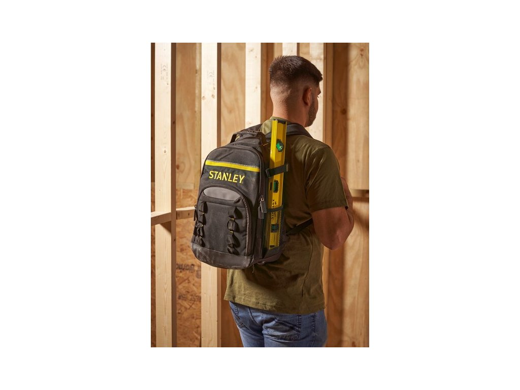 Vyroben z pevné a odolné tkaniny s hustotou 600 vláken 50 přihrádek a kapes pro snadnou orientaci v uloženém nářadí. Vstřikované polypropylenové dno chrání obsah před vlhkostí a nečistotami. Vyjímatelná přepážka se sponou na opasek a držáky nářadí umožňuje samostatnou manipulaci s nejpoužívanějším nářadím. Pevná konstrukce udržuje při odložení stálý tvar. Ramenní popruhy a zadní strana batohů polstrovány prodyšným materiálem. Oddělená, vyztužená přihrádka pro uložení notebooku, elektro nářadí, apod. Nařadí není součástí dodávky. Technické parametry 36 x 23 x 54 cm. Nosnost 15Kg