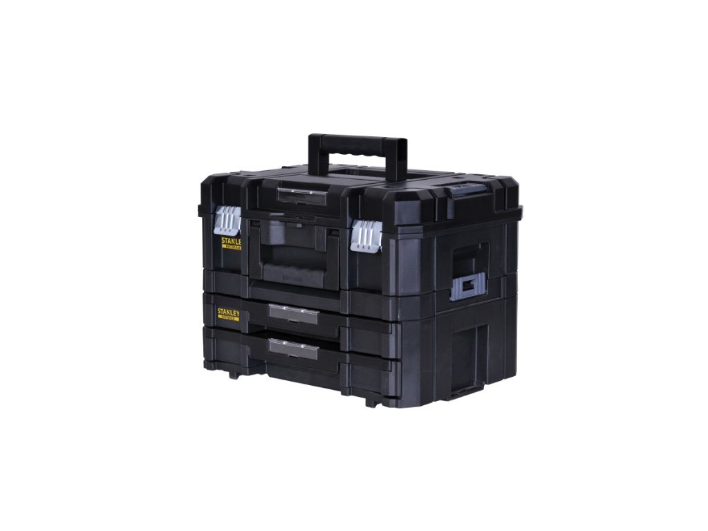 Combo box TSTAK FatMax STANLEY. Dvě madly (přední, boční), dvě zásuvky s nastavitelnými přihrádkami pro skladování a přepravu nářadí.