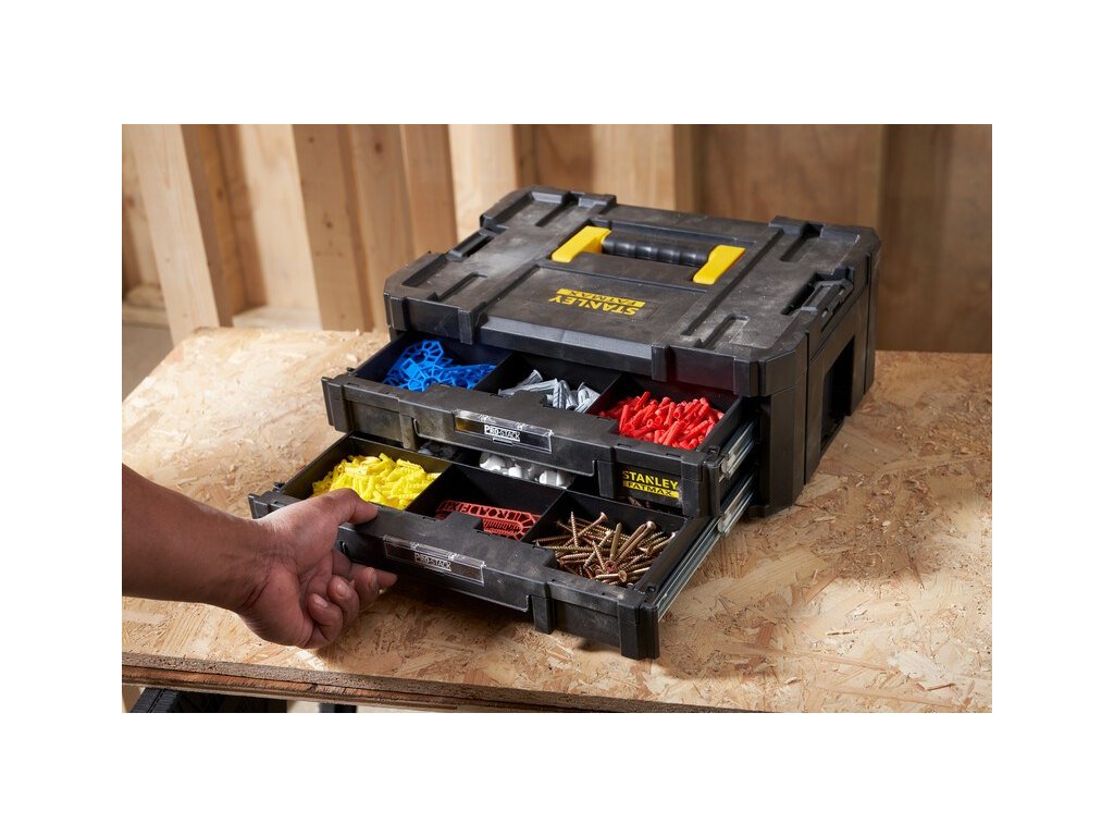 Box na nářadí se 2 mělkými zásuvkami, 440 x 330 x 176 mm, TSTAK IV FatMax Stanley FMST1-71969. BOX plastový na nářadí se 2 mělkými zásuvkami TSTAK IV FatMax pro skladování a přepravu nářadí. Možnost skládání různých boxů v systému TSTAK V FatMax