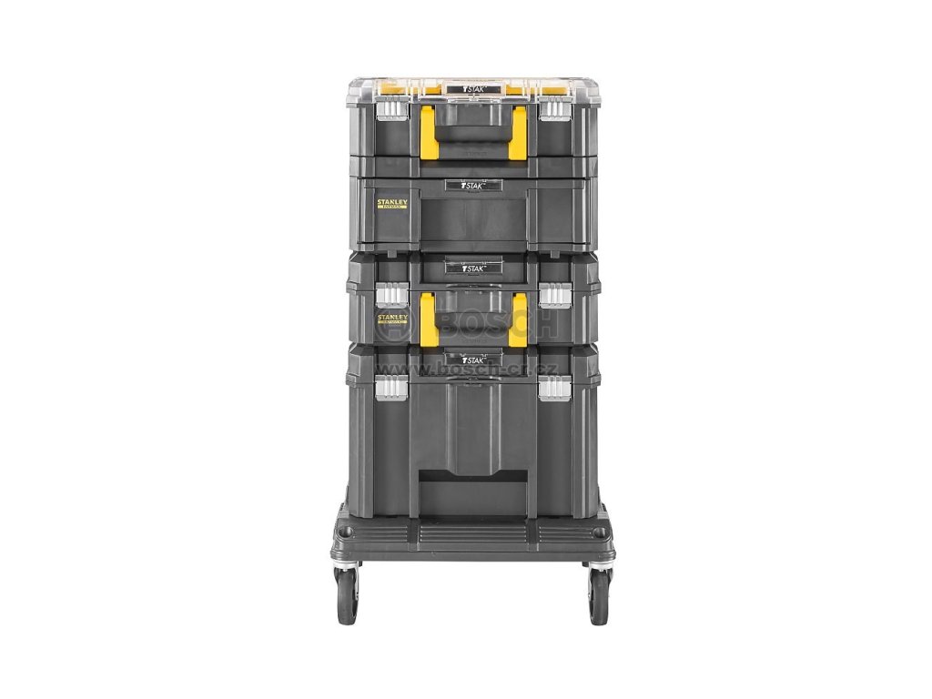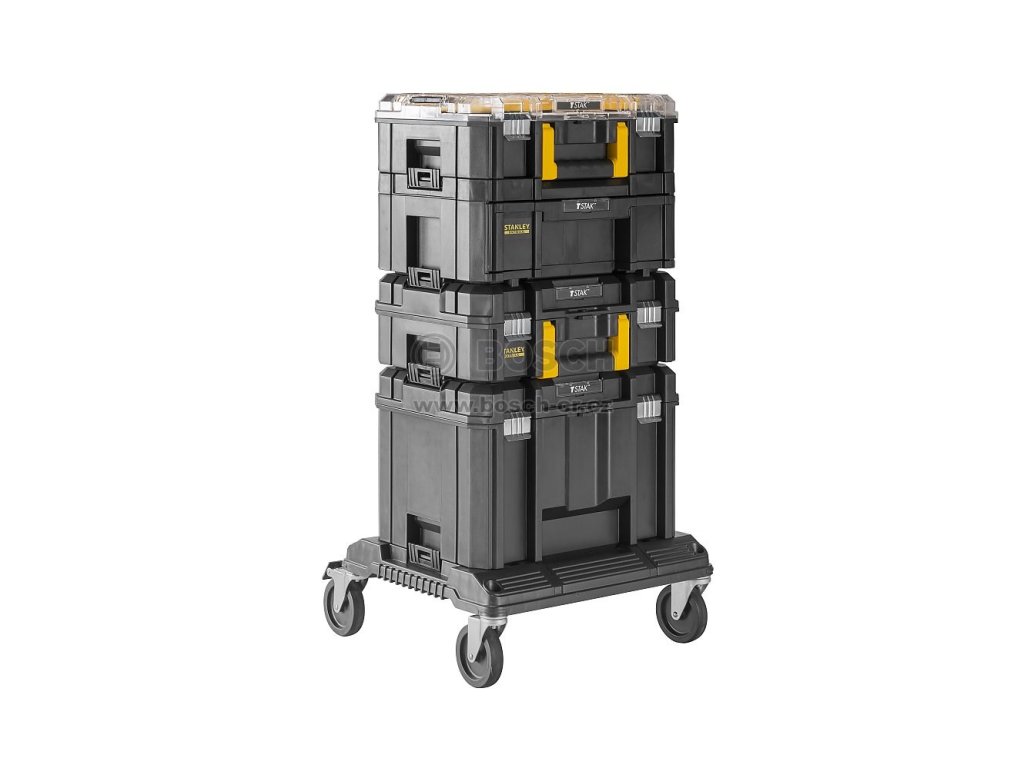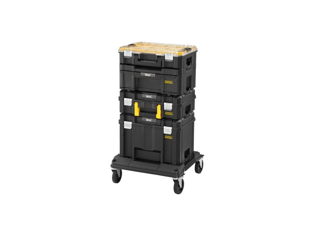 Věž TSTAK FatMax Stanley FMST1-80107 složená z podvozku a čtyř kufrů řady TSTAK. - Podvozek pro kufry TSTAK FMST1-71972 - Hluboký box TSTAK VI FMST1-71971 - Box na nářadí TSTAK II FMST1-71966 - Hluboká zásuvka TSTAK III FMST1-71968 - Organizér TSTAK V FMST1-71970Doplňkové parametry