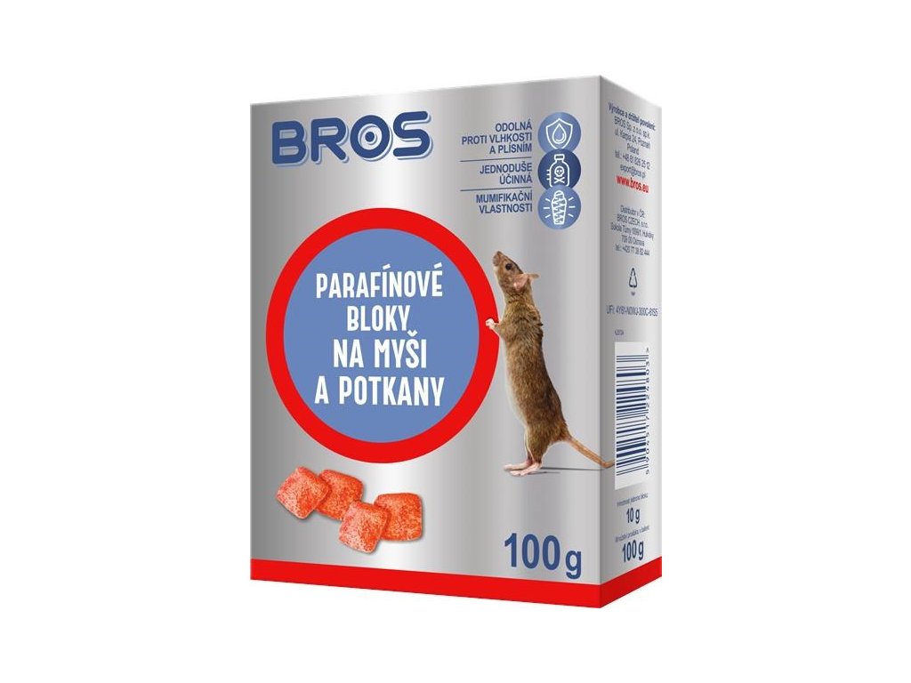 Trápí vás myši nebo potkani a hledáte účinné řešení v menším balení? Bros parafínové bloky jsou spolehlivou volbou pro hubení těchto škůdců. Díky odolnosti vůči vlhkosti a atraktivnímu složení zajistí rychlou a efektivní deratizaci vašeho domu, zahrady či provozovny. Objednejte si Bros parafínové bloky 100 g ještě dnes a získejte klid bez hlodavců!
