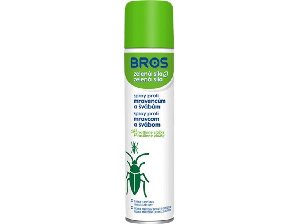 Bros zelená síla na mravence a šváby – prej na bázi rostlinného původu pyrethru – insekticidu, získaného z květů dalmatských chryzantém je vhodný na likvidaci mravenců. švábů, pavouků a dalšího lezoucího hmyzu. Proč zelená síla? Tato řada produktů BROS zelená síla je první řada produktů na likvidaci hmyzu, která je založena pouze na účinných látkách rostlinného původu. Tato řada byla vytvořena speciálně pro uživatele, které nechtějí nebo nemohou používat produkty obsahující syntetické aktivní složky, ale zároveň hledají spolehlivou a dlouhodobou ochranu proti hmyzu. Výrobky obsahují dvě aktivní přírodní složky – pyrethru a citridiolu.Doplňkové parametry