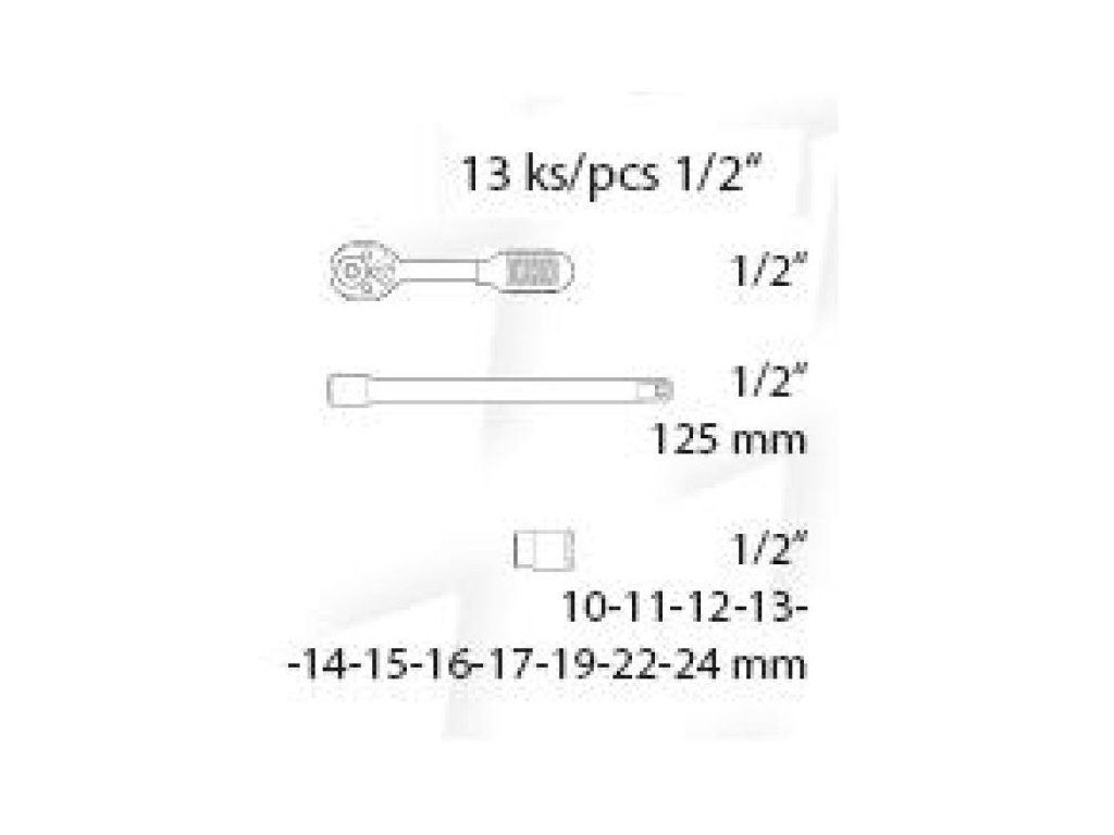 - 10x hlavice 1/2": 10; 11; 12; 13; 14; 15; 17; 19; 22; 24 mm