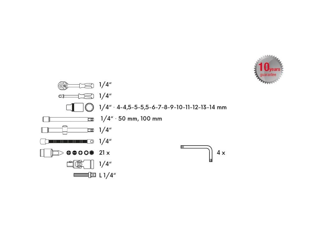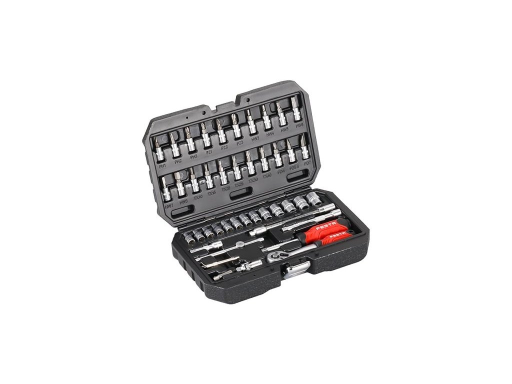 Kvalitní 45 dílná gola sada 1/4" FESTA 17233 v praktickém plastovém kufříku je vhodná díky kvalitě použitých materiálů a zpracování i k použití v profesionální autodílně nebo servisu. Nářadí je z chrom-vanadiové oceli, hroty bitů jsou ze slitiny oceli S2. Ráčny mají jemné dělení 72 zubů. plastový kufr je ve zcela novém designu s kovovými uzávěry a panty víka.Specifikace: