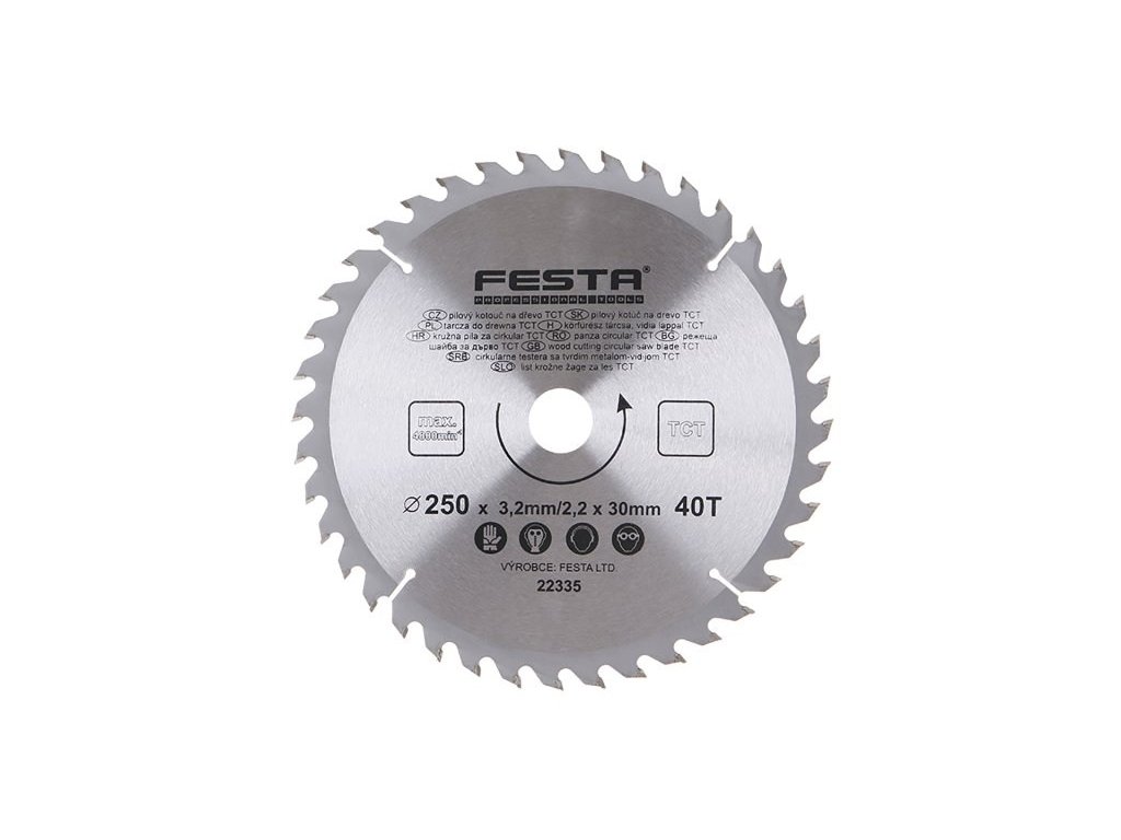 Pokud používáte ve vaší domácí či profi dílně kotoučovou pilu, tak jistě skvěle využijete tento kvalitní pilový kotouč Festa s průměrem 250 mm, který je vyroben z vysoce kvalitní uhlíkové oceli, obvod kotouče je lemován střídavě šikmými zuby s SK plátky. SK plátky, tj. plátky ze slinutých karbidů se vyznačují vysokou výdrží a mechanickou odolností. Pilový kotouč s SK plátky je pomocník pro kvalitní dělení měkkého i tvrdého dřeva. Umožňuje řezat či krátit prkna, trámy, hranoly, palubky, latě i další dřevěné tvary, a to příčně i podélně. Pozitivní úhel střídavě šikmých zubů, spolu s úzkým profilem kotouče, garantují klidný chod a bezpečný řez bez nežádoucích vibrací. Otáčet se může maximální rychlostí 4500 otáček za minutu. S jeho kvalitním provedením bude pro vás práce velkým potěšením.Specifikace:
