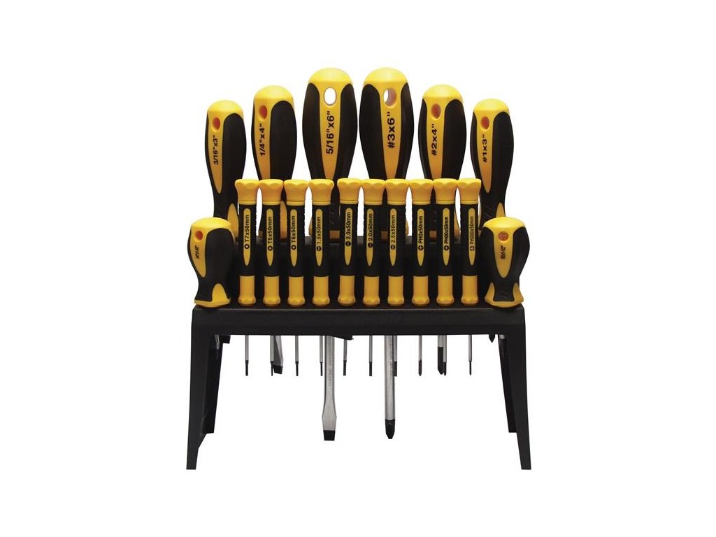 Osmnáctidílná sada šroubováků Festa s praktickým plastovým stojánkem. Šroubovák má kovový dřík vyroben z velmi kvalitní chrom-vanadové oceli, kalený hrot je magnetický, povrchově chráněný tvrdochromem, kombinace polypropylenu a pryže na ergonomicky tvarované rukojeti zaručuje výborné antiskluzové vlastnosti a dobrou odolnost vůči mazadlům a chemikáliím. Zakončení šestihraného dříku procházejícího celou rukojetí je možné použít jako úderovou plochu pro kladivo. Přesně frézovaný magnetický hrot.Specifikace: