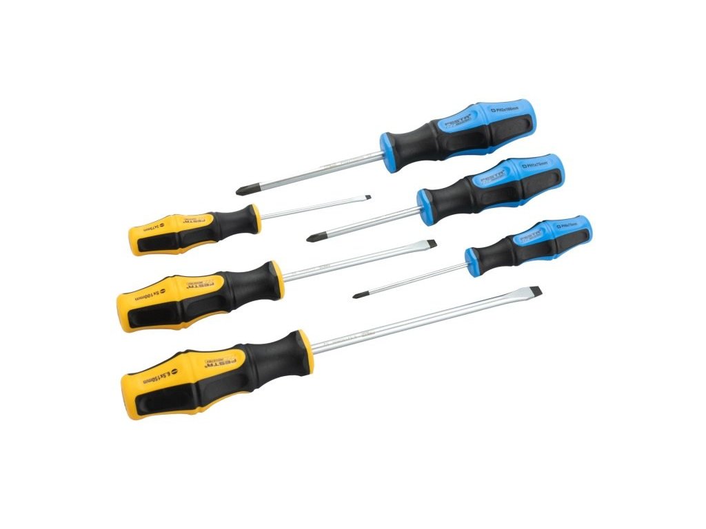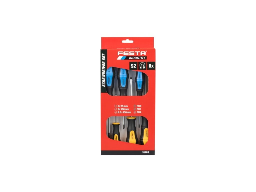Šestidílná sada šroubováků Festa v praktickém plastovém pouzdře. Dřík je vyroben z velmi kvalitní oceli S2, kalený hrot je magnetický, povrchově chráněný tvrdochromem. Kombinace polypropylenu a pryže na ergonomicky tvarované dvoukomponentní rukojeti zaručuje výborné antiskluzové vlastnosti a dobrou odolnost vůči mazadlům a chemikáliím.Specifikace: