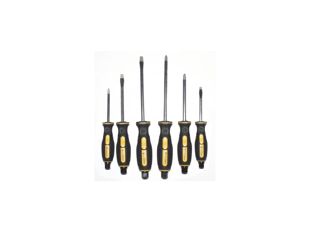 Šestidílná sada šroubováků Festa. Šroubovák má kovový dřík vyroben z velmi kvalitní chrom-vanadové oceli, kalený hrot je magnetický, povrchově chráněný tvrdochromem, kombinace polypropylenu a pryže na ergonomicky tvarované rukojeti zaručuje výborné antiskluzové vlastnosti a dobrou odolnost vůči mazadlům a chemikáliím. Zakončení šestihraného dříku procházejícího celou rukojetí je možné použít jako úderovou plochu pro kladivo nebo povolování a utahování pomocí klíče nebo ráčny s nástrčným klíčem. Přesně frézovaný magnetický hrot.Specifikace: