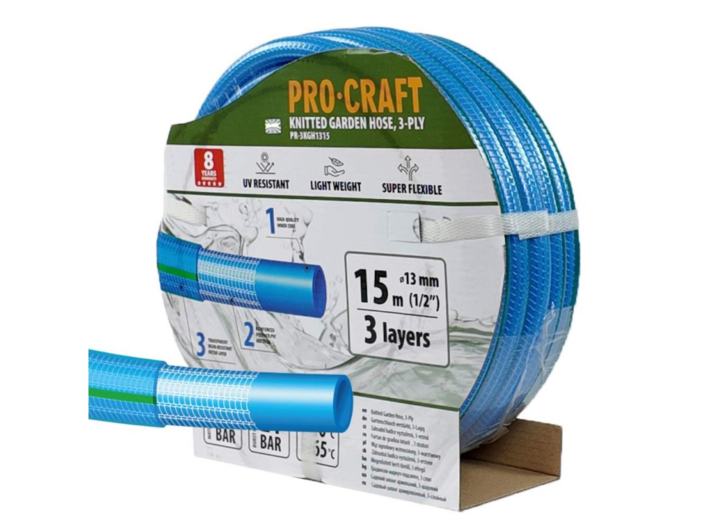 Zahradní hadice Procraft je určena k zalévání a zavlažování zahrad, pozemků. Zesílená třívrstvá zahradní hadice s tkanou výztuhou má vysokou životnost až 8 let. Kvalitní zpracovaní hadice zajišťuje vysokou odolnost UV záření, povětrnostním vlivům a proti teplotám (-10 až +65). Hadice je velmi flexibilní, robustní a odolná proti zlomení. Výhody: Dlouhá životnost 3 vrstvy Odolná proti UV záření Vysoká teplotní odolnost -10 do +65 °C Neobsahuje ftaláty a těžké kovy Kvalitní PVC vyztužená tkaninou Parametry Délka 15 m Průměr hadice 1/2 mm Průměr hadice (palce) 13 \" Barva modrá Max tlak, atm 21 Pracovní tlak 7Doplňkové parametry