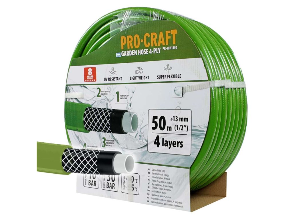 Zahradní hadice Procraft je určena k zalévání a zavlažování zahrad, pozemků. Zesílená 4-vrstvá zahradní hadice s tkanou výztuhou má vysokou životnost až 8 let. Kvalitní zpracovaní hadice zajišťuje vysokou odolnost UV záření, povětrnostním vlivům a proti teplotám (-10 až +65). Hadice je velmi flexibilní, robustní a odolná proti zlomení. Výhody: Dlouhá životnost 4 vrstvy Odolná proti UV záření Vysoká teplotní odolnost -10 do +65 °C Neobsahuje ftaláty a těžké kovy Kvalitní PVC vyztužená tkaninou Parametry Barva zelená Délka 50 m Průměr hadice 13 mm Průměr hadice (palce) 1/2 \" Max tlak, atm 30 Pracovní tlak 10Doplňkové parametry