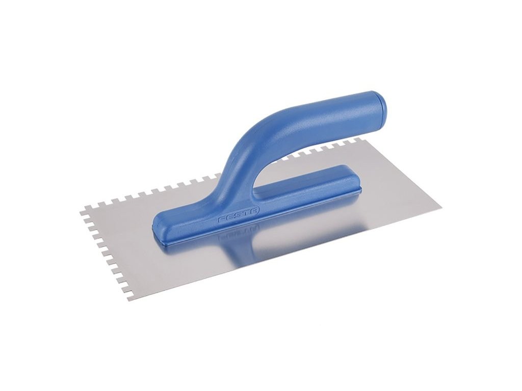 Hladítko nerezové zubové FESTA 280x130 mm, zub e6, s plastovou ručkou, tl.plechu 0,8 mm. Používá se zejména k nanášení lepidel pod obklady a dlažby, dále pak k nanášení stěrek, štuků, omítek, tmelů a dalších stavebních hmot. Hladítko nerezové zubové umožní natáhnout lepidlo či stavební hmotu v pruzích a výšce dle zubu hladítka.