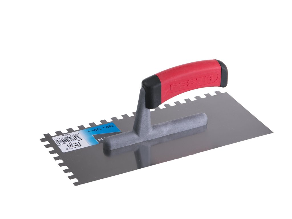 Hladítko nerezové zubové FESTA 280x130 mm, zub e8, s gumovou ručkou, tl.plechu 1mm. Používá se zejména k nanášení lepidel pod obklady a dlažby, dále pak k nanášení stěrek, štuků, omítek, tmelů a dalších stavebních hmot. Hladítko nerezové zubové umožní natáhnout lepidlo či stavební hmotu v pruzích a výšce dle zubu hladítka.