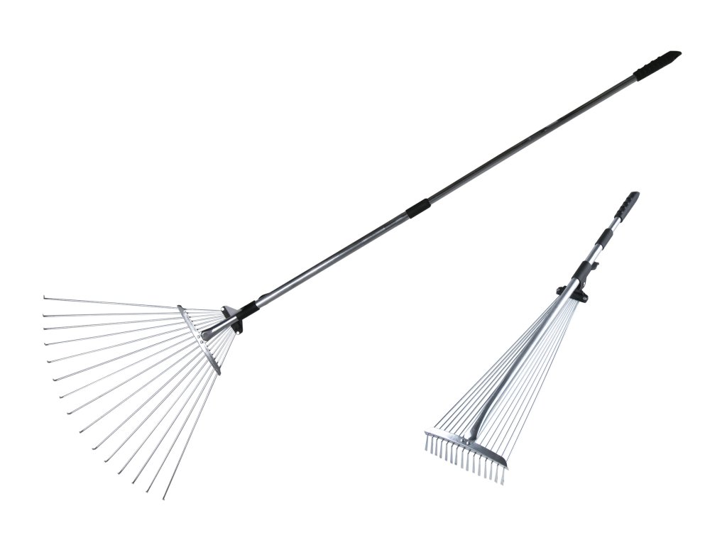Švédské hrábě s kovovým klipem - pojistkou, nastavitelná rozteč lamel, teleskopická rukojeť, použití : k hrabání listí, trávy.