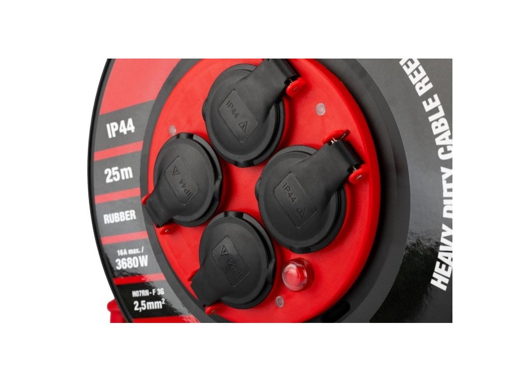 prodlužovací kabel na bubnu se 4mi zásuvkami 3 x 2,5 mm na 230 V, pro venkovní použití - i trvalé maximalní zatížení - rozvinutý buben 3680 W (16 A) / navinutý max 1300 W (5,6 A) odolný materiál vnější izolace NEOPRÉN - pro náročné podmínky na stavbách i jiných provozech, odolová olejům i extrémním podmínkám - teplotní odolnost je v rozmezí -25°C až 60°C - je odolnější než guma větší průřez jednotlivých vodičů 3 x 2,5 mm s gumovou izolací - pro větší proudové zatížení - např. svářečky, bourací kladiva, kompresory, apod. krytí IP44 - odolné proti prachu a stříkající vodě kovová, masivní konstrukce bubnu pro snadnou manipulaci a stabilní instalaci, cívka bubnu z kvalitního odolného ABS plastu tepelná pojistka proti přehřátíDoplňkové parametry