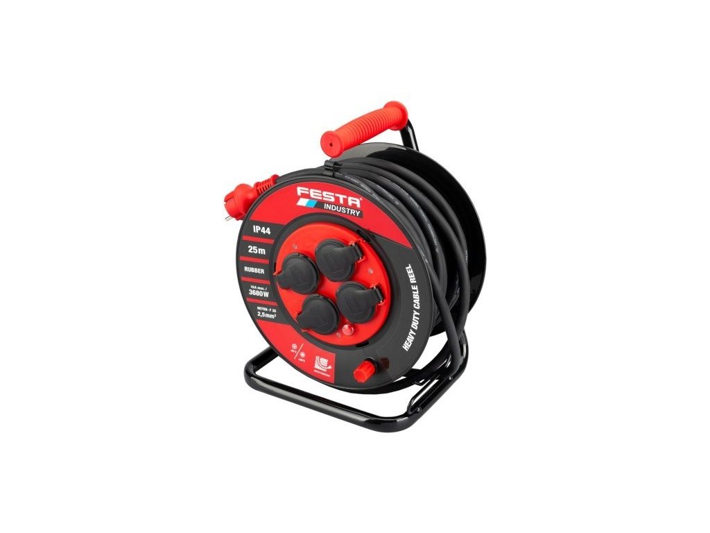 Kabel prodlužovací na bubnu venkovní FESTA INDUSTRY 3x2.5mm 25m 230V max 3680W 4 zásuvky guma-neoprén IP44