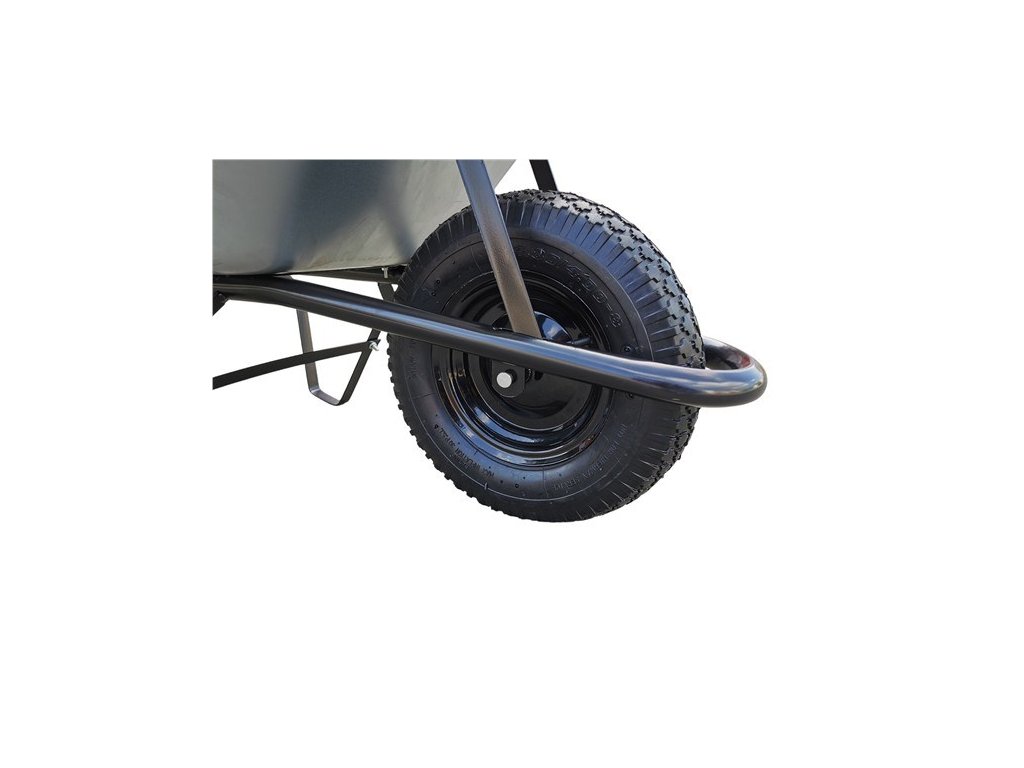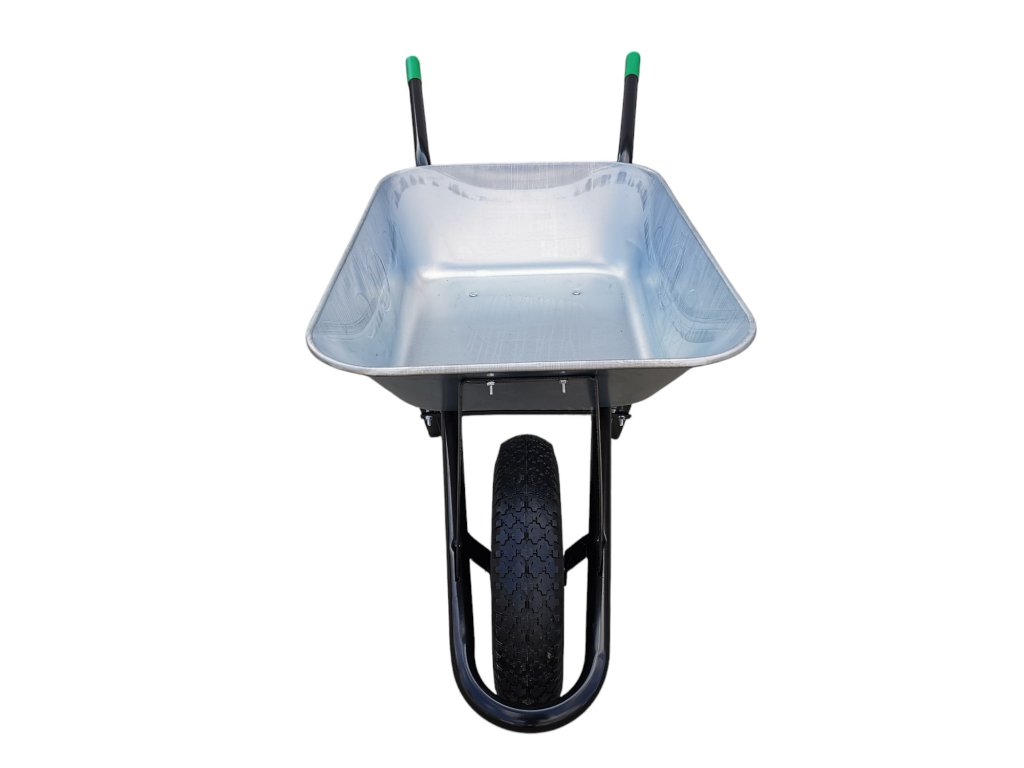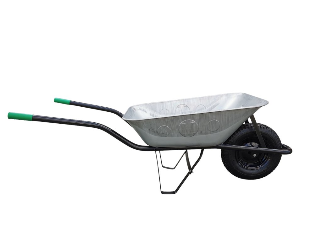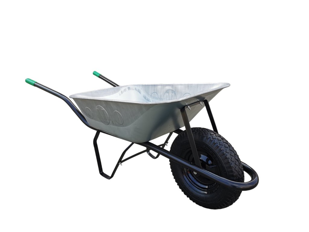 Klasické stavební/zahradní kolečko s pozinkovanou taženou korbou o objemu 80 l a kovovým rámem. Nafukovací kolo je vhodné do různých terénů a snadné na manipulaci.
