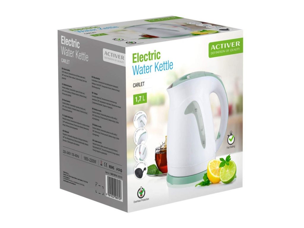 Varná konvice s plochým dnem z nerezové oceli o objemu 1,7 l je nedílnou součástí každé kuchyně. Má moderní design s průhledovým ukazatelem množství vody a ochranou proti přehřátí. Základna se středovým konektorem - 360 stupňů, vyjímatelný filtr, automatické / manuální vypnutí a světelný indikátor provozu. Dodávána v zeleno-bílé barvě. Technické parametry produktu: ACTIVER Konvice plastová CARLET 1,7 l, 1850-2200W, otočná o 360st., zelenobílá Objem (l): 1,7 Barva: Zeleno-bílá Provozní napětí (V/Hz): 220 - 240 / 50 - 60 Příkon (W): 1850 - 2200 Hmotnost netto (kg): 0,010 Hmotnost brutto (kg): 0,010 Filtr: Ano Skrytá spirála: Ano Bezpečnostní pojistka: Ano Regulace teploty: Ne Kontrolka provozu: Ano Středový konektor: Ano Termostat: Ne Délka kabelu (m): 0,75Doplňkové parametry