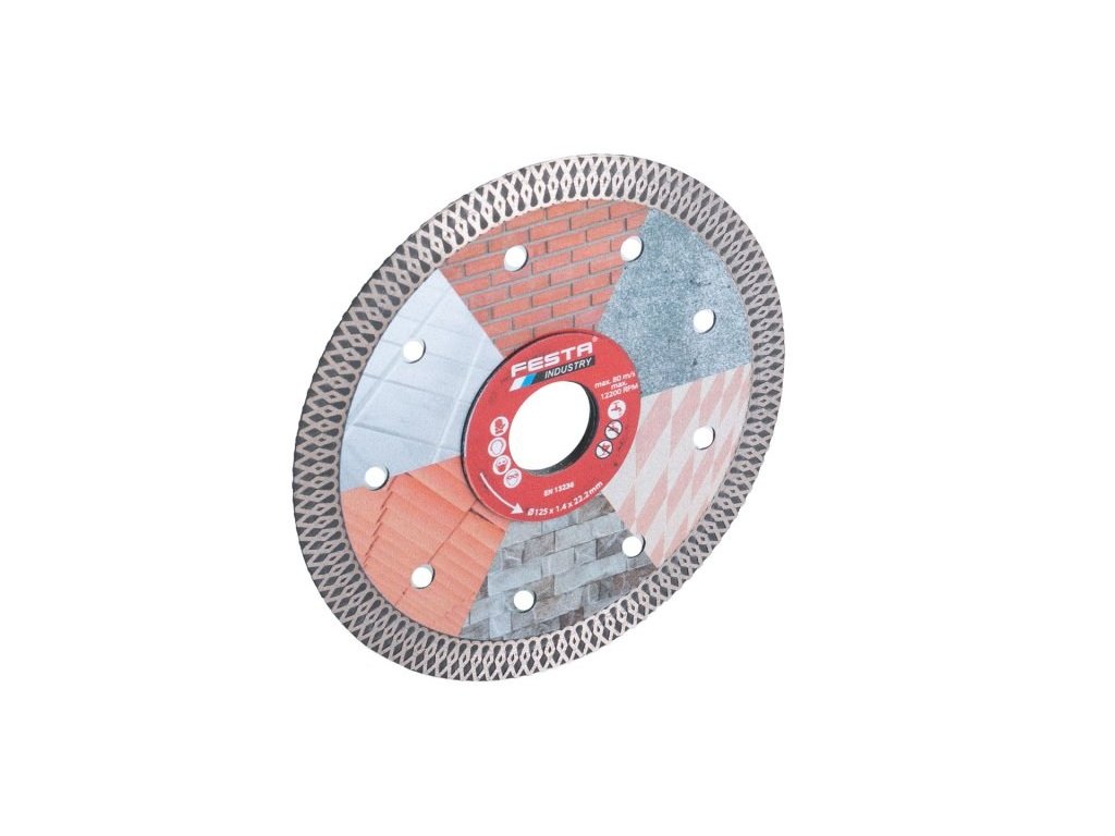 Profesionální diamantový kotouč FESTA INDUSTRY, provedení : \"PLNÝ\" - celoobvodový, kvalitní diamantová vrstva s vysokým obsahem diamantového prachu, přesné zpracování - napojení na nosný disk kotouče odolávající vysokým teplotám, chladící otvory v těle kotouče pro maximální chlazení kotouče při práci. Speciální tvar segmentů pro velmi rychlé řezání, dlouhá životnost. Použití : určený pro mokré i suché řezání dlažby a obkladů, betonu, železobetonu, cihel, zdiva, žuly, mramoru, kamene, keramiky, balení : blistr s eurootvorem, přiložen redukční kroužek z O 22,2 na 20 mm, rozměry : uvedeny v názvu výrobku.