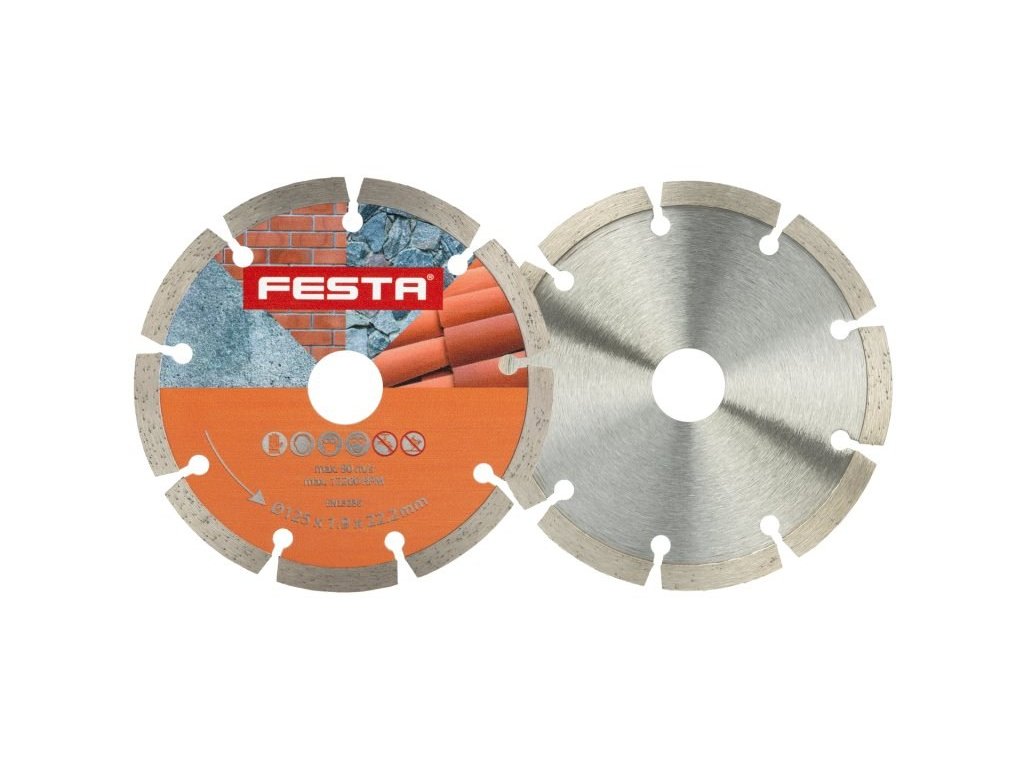 Profesionální diamantový kotouč FESTA, provedení : SEGMENTOVÝ, kvalitní materiály i zpracování - vysoce pevné uchycení diamantových segmentů k nosnému disku kotouče, vysoký obsah diamantového prachu v segmentech, použití : pro suché řezání betonu, cihel, zdiva, kamene, ... , balení : blistr s eurootvorem, přiložen redukční kroužek z O 22,2 na 20 mm, rozměry : uvedeny v názvu výrobku.