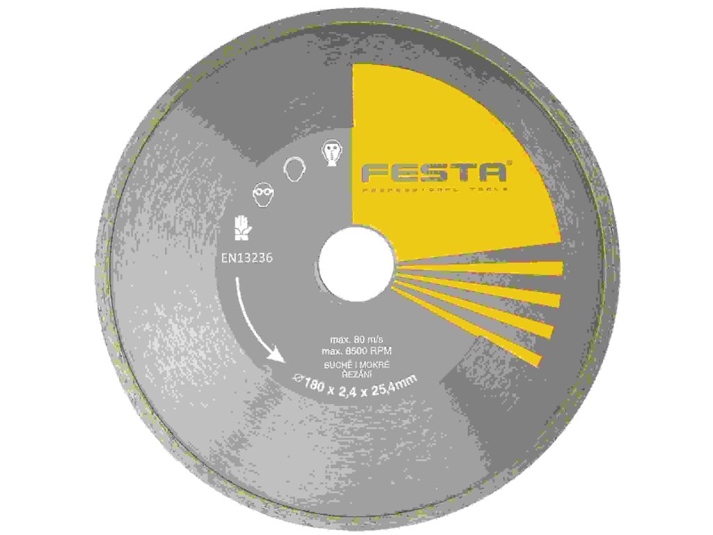 Profesionální diamantový kotouč FESTA, provedení : \"PLNÝ\" - celoobvodový, kvalitní diamantová vrstva s vysokým obsahem diamantového prachu, přesné zpracování - napojení na nosný disk kotouče odolávající vysokým teplotám, použití : určený pro mokré i suché řezání dlažby a obkladů, betonu, cihel, zdiva, žuly, mramoru, kamene, skla, keramiky, balení : blistr s eurootvorem, přiložen redukční kroužek z O 22,2 na 20 mm, rozměry : uvedeny v názvu výrobku.
