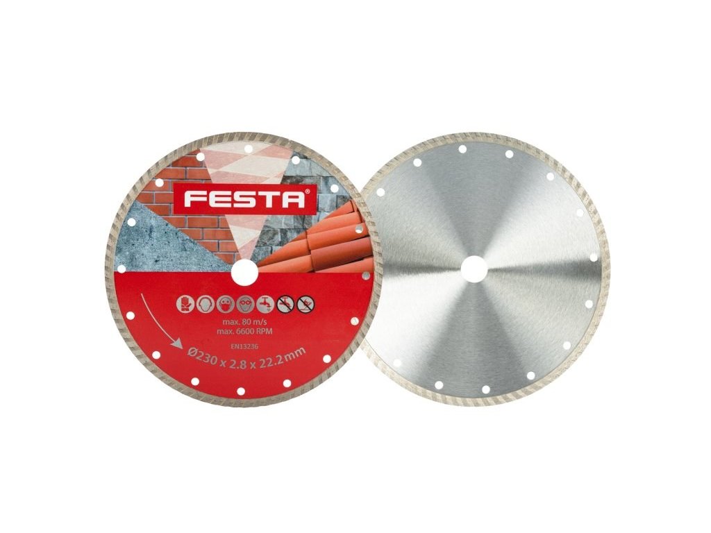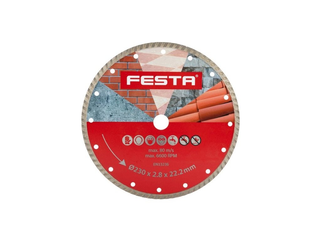Diamantový kotouč FESTA, provedení : TURBO, kvalitní materiály i zpracování, speciální tvar diamantových segmentů i konstrukce a pevné uchycení k nosnému disku kotouče, vysoký obsah diamantového prachu, použití : pro suché i mokré řezání betonu, železobetonu, cihel, zdiva, kamene, balení : blistr s eurootvorem, přiložen redukční kroužek z O 22,2 na 20 mm, rozměry : uvedeny v názvu výrobku.