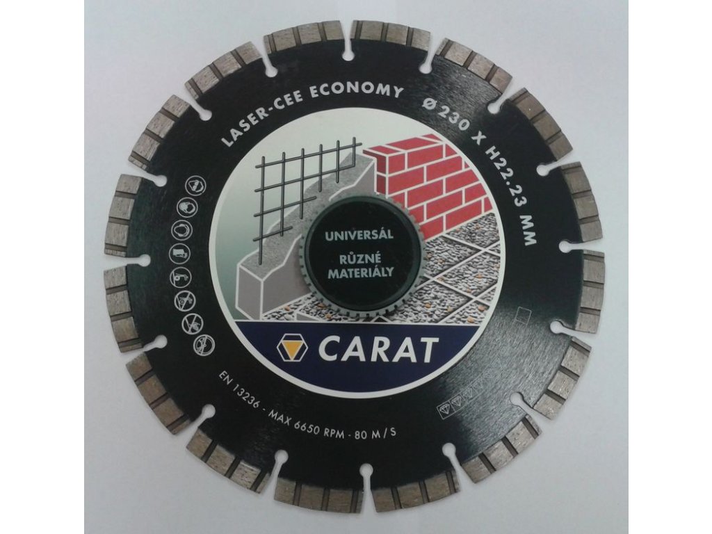 Carat diamantový univerzální řezací kotouč 230mm (CEE2303010) Cenově velice výhodný dia kotouč na různé materiály Univerzální kotouč na různém materiály Průměr 230 mm Otvor 22,23 mm Segment 10 mm Pro suché použití Pro úhlové bruskDoplňkové parametry