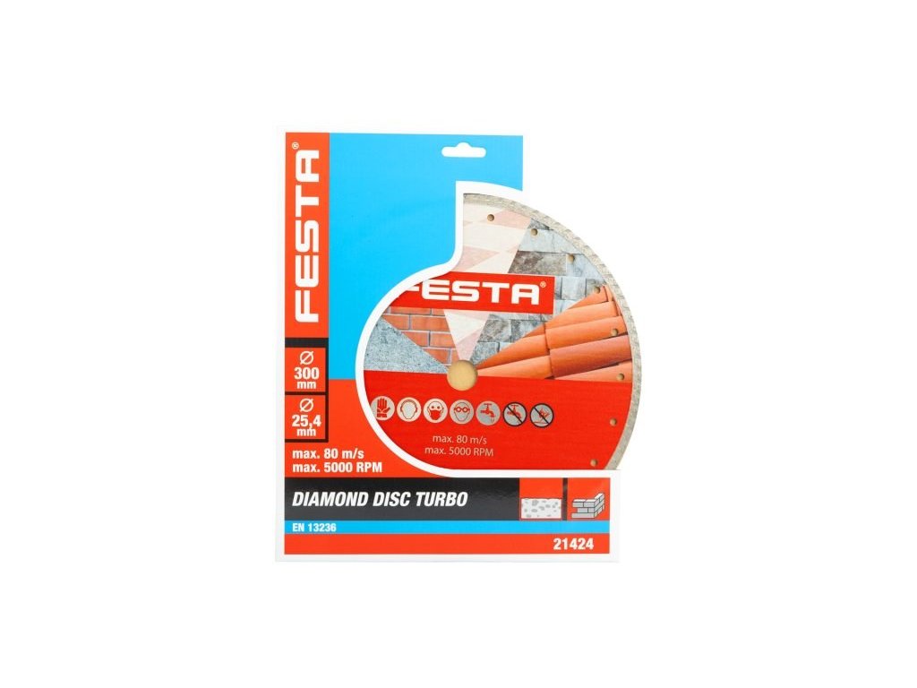Diamantový kotouč FESTA, provedení : TURBO, kvalitní materiály i zpracování, speciální tvar diamantových segmentů i konstrukce a pevné uchycení k nosnému disku kotouče, vysoký obsah diamantového prachu, použití : pro suché i mokré řezání betonu, železobetonu, cihel, zdiva, kamene, balení : blistr s eurootvorem, přiložen redukční kroužek z O 22,2 na 20 mm, rozměry : uvedeny v názvu výrobku.