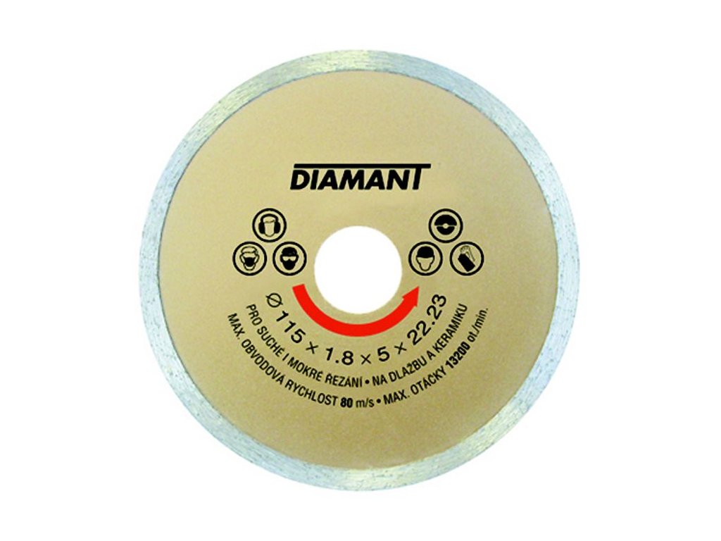 Diamantový kotouč DIAMANT, provedení : \"PLNÝ\" - celoobvodový, kvalitní diamantová vrstva s vysokým obsahem diamantového prachu, přesné zpracování - napojení na nosný disk kotouče odolávající vysokým teplotám, použití : určený pro mokré i suché řezání dlažby a obkladů, betonu, cihel, zdiva, žuly, mramoru, kamene, skla, keramiky, balení : blistr s eurootvorem, přiložen redukční kroužek z O 22,2 na 20 mm, rozměry : uvedeny v názvu výrobku.