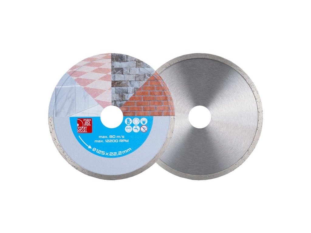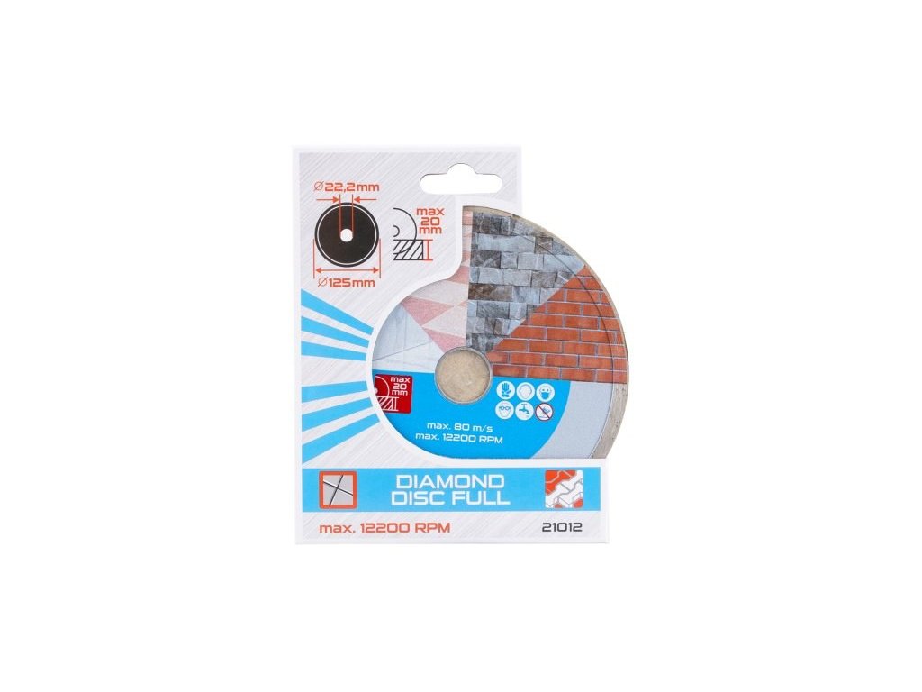 Diamantový kotouč DIAMANT, provedení : \"PLNÝ\" - celoobvodový, kvalitní diamantová vrstva s vysokým obsahem diamantového prachu, přesné zpracování - napojení na nosný disk kotouče odolávající vysokým teplotám, použití : určený pro mokré i suché řezání dlažby a obkladů, betonu, cihel, zdiva, žuly, mramoru, kamene, skla, keramiky, balení : blistr s eurootvorem, přiložen redukční kroužek z O 22,2 na 20 mm, rozměry : uvedeny v názvu výrobku.