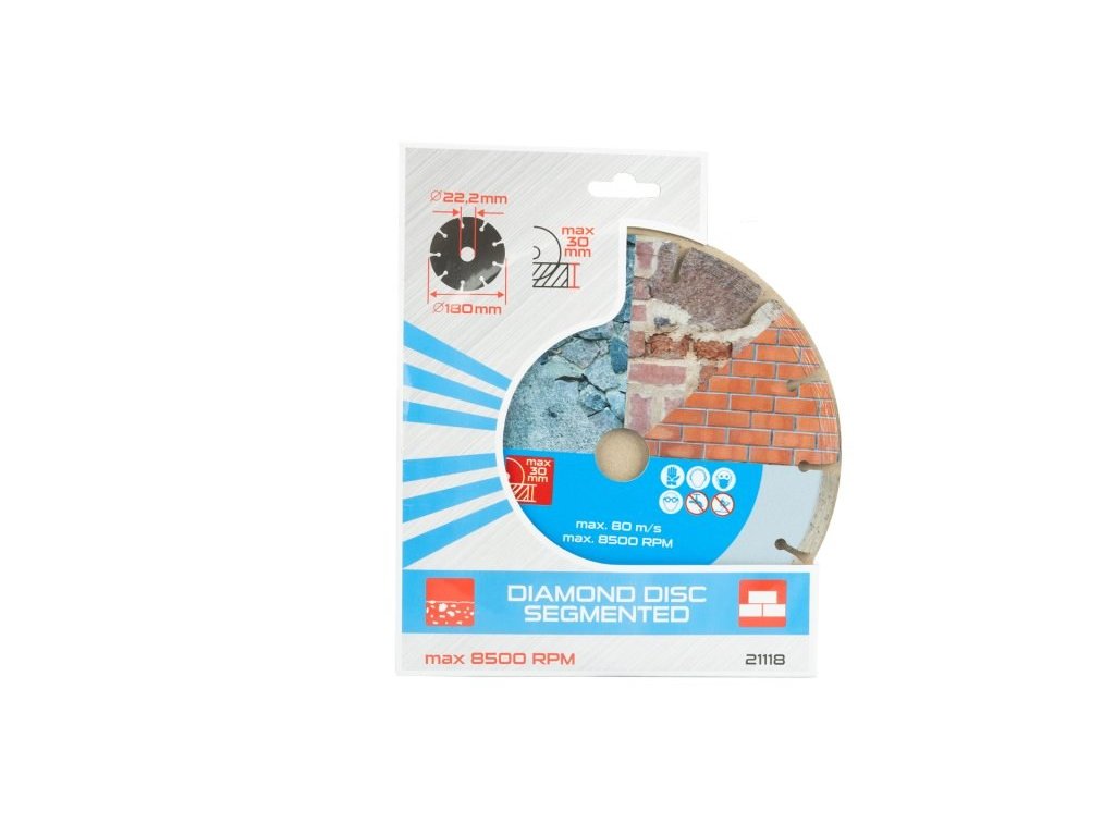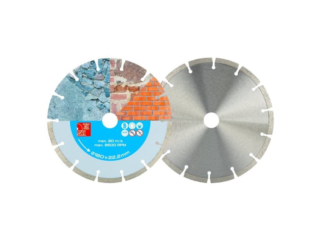 Diamantový kotouč DIAMANT, provedení : SEGMENTOVÝ, kvalitní materiály i zpracování - vysoce pevné uchycení diamantových segmentů k nosnému disku kotouče, vysoký obsah diamantového prachu v segmentech, použití : pro suché řezání betonu, cihel, zdiva, kamene, ... , balení : blistr s eurootvorem, přiložen redukční kroužek z O 22,2 na 20 mm, rozměry : uvedeny v názvu výrobku.