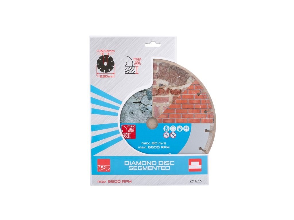 Diamantový kotouč DIAMANT, provedení : SEGMENTOVÝ, kvalitní materiály i zpracování - vysoce pevné uchycení diamantových segmentů k nosnému disku kotouče, vysoký obsah diamantového prachu v segmentech, použití : pro suché řezání betonu, cihel, zdiva, kamene, ... , balení : blistr s eurootvorem, přiložen redukční kroužek z O 22,2 na 20 mm, rozměry : uvedeny v názvu výrobku.