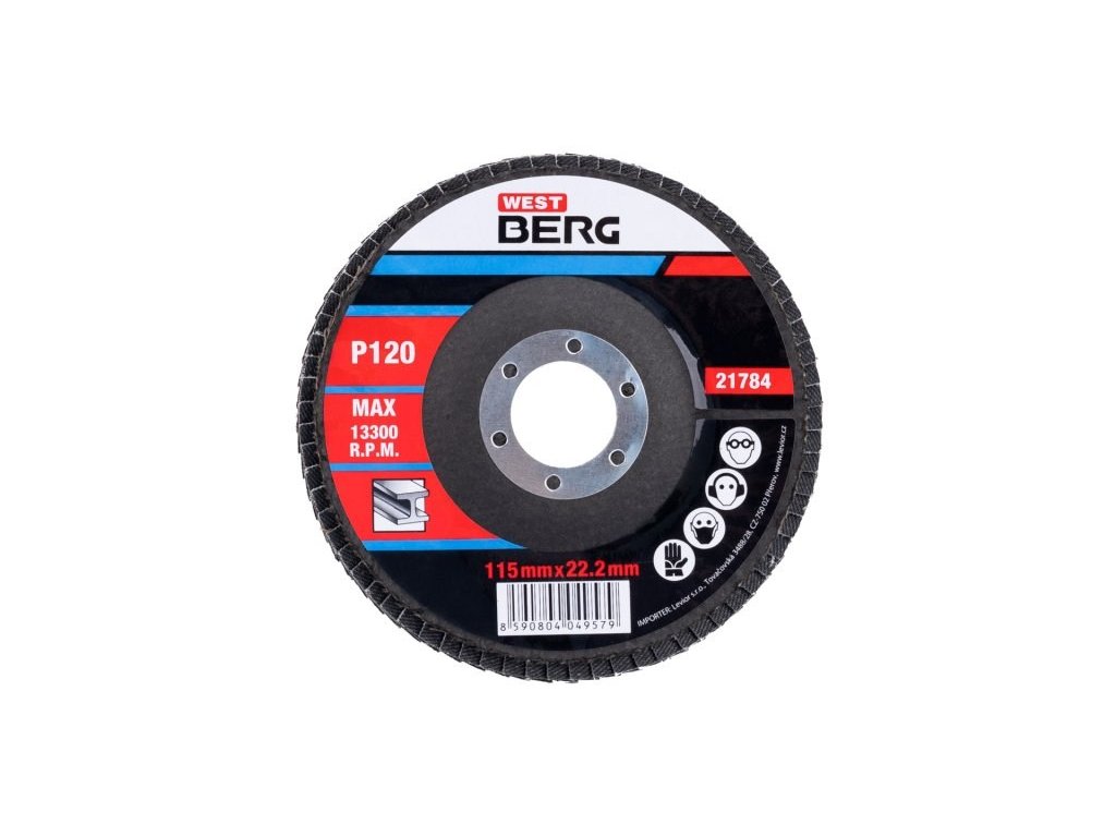 Lamelový kotouč, zrnitost: 120 druh zrna: oxid hlinitý pojivo: umělá pryskyřice podkladový materiál: pružná tkanina - 100% bavlna (240-260g/m2) provedení: vyhnutý otvor : 22,2mm, max. pracovní rychlost : 80m/s, max. přípustné otáčky: 13300 1/min, použití : broušení, obrušování, odrezování, odstraňování nátěrů, ...., rozměry : uvedeny v názvu výrobku.Doplňkové parametry