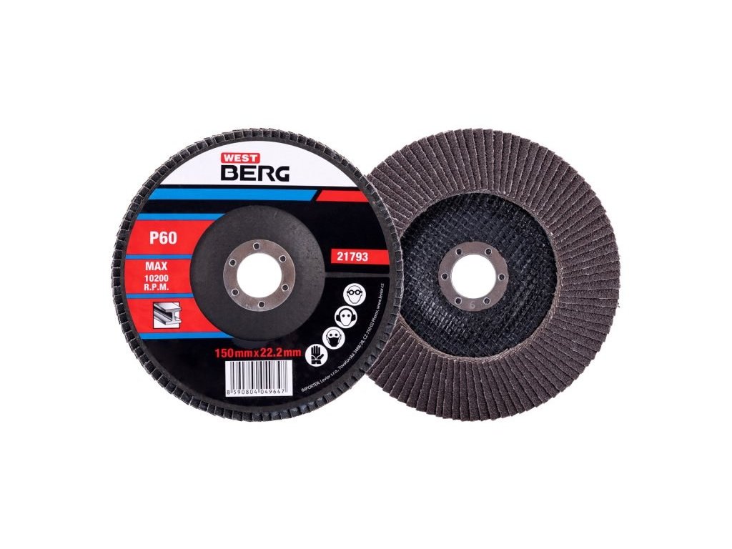 Lamelový kotouč, zrnitost: 60; druh zrna: oxid hlinitý; pojivo: umělá pryskyřice; podkladový materiál: pružná tkanina - 100% bavlna (240-260g/m2); provedení: vyhnutý; otvor : O 22,2mm, max. pracovní rychlost : 80m/s, max. přípustné otáčky: 13300 1/min, použití : broušení, obrušování, odrezování, odstraňování nátěrů, ...., rozměry : uvedeny v názvu výrobku.