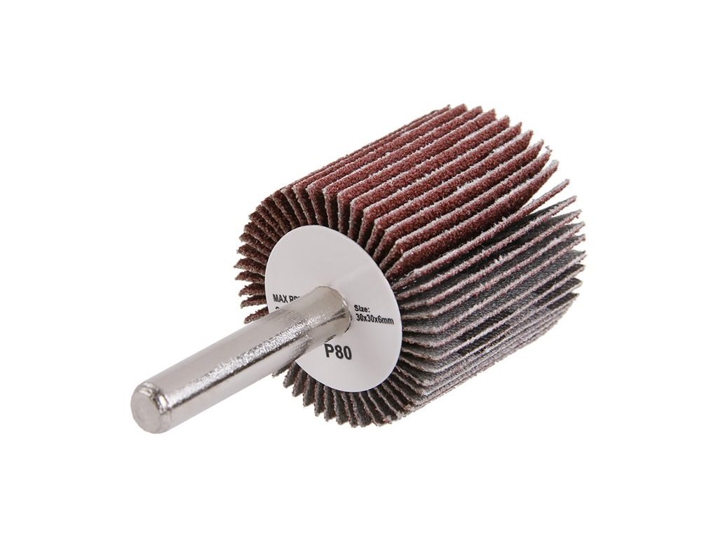 Brusný lamelový kotouč na stopce, zrnitost: 80 druh zrna: oxid hlinitý pojivo: umělá pryskyřice podkladový materiál: pružná tkanina - 100% bavlna (240-260g/m2) použití : broušení, obrušování, odrezování, odstraňování nátěrů.Doplňkové parametry