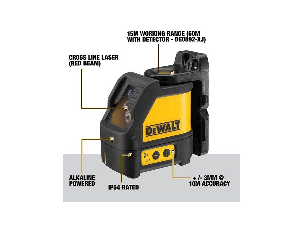 POPIS: Laserový kříž pro vyrovnávací práce s automatickým srovnáním s přesností ± 0,3 mm/m. Automatické srovnání až do hodnoty 4° povrchového úhlu s automatickou indikací srovnání, označením a vyrovnáním během několika sekund. Obsluha pomocí dvou tlačítek a indikátor nabití baterií usnadňují použití. Zabudovaná magnetická otočná konzola umožňuje jednoduché připevnění na kovové povrchy. Tvarovaný kryt přístroje a silné sklo chrání toto nářadí a umožňuje zachování kalibrace v náročných pracovních podmínkách. Obsahuje 3 baterie typu AA, které umožňují provozní dobu delší než 40 hodin. Pouzdro chrání jednotku a umožňuje zachování kalibrace při uložení s jiným nářadím. Pracuje společně s detektorem DE0892 až do vzdálenosti 50 metrů. STANDARDNÍ VÝBAVA: 3 alkalické baterie AA konzoly pro montáž na zeď úložné pouzdro TECHNICKÉ PARAMETRY: Napájení 4,5 V 4 x AA Hmotnost 0,46 kg (bez baterie) Délka 112 mm Počet paprsků 2 Distribuce CZ Přesnost měření ± 0,3 mm/m Připojení stojanu 1/4\" Směr paprsku 2 směry Třída laseru 2, < 1 mW Výška 113 mm Pracovní dosah 15 m Rozsah samonivelace ± 4° Model DW088KDoplňkové parametry