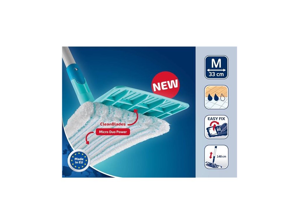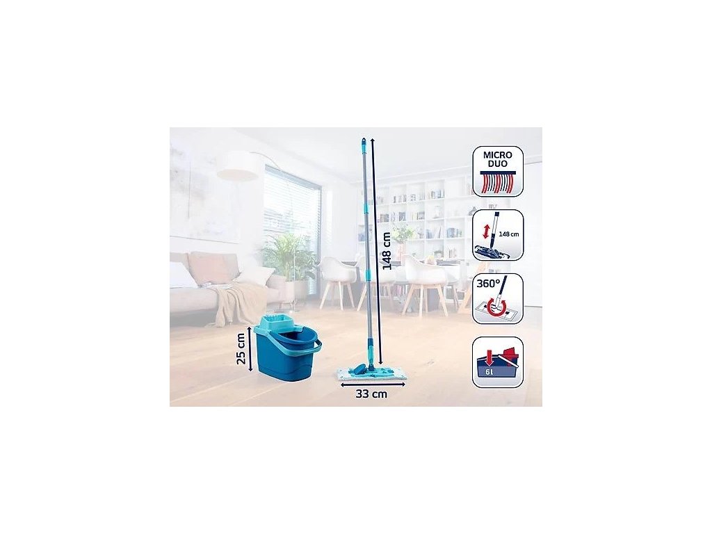 Mop disponuje **šířkou záběru 33 cm** a je osazen vysoce účinným návlekem **micro duo**. Ten využívá technologii dvou typů vláken: mírně vystouplé štětiny uvolňují nečistoty i z hlubokých pórů a spár, zatímco mikrovlákna špínu okamžitě absorbují. Díky extrémně odolné konstrukci a **360° kloubu** je manévrování s mopem mimořádně plynulé a dovoluje vytírání pod nábytkem i v rozích. Teleskopická násada je vybavena systémem **Click System**, což umožňuje její kompatibilitu s dalšími nástavci Leifheit. Celá sada je navržena pro maximální stabilitu a dlouhou životnost i při intenzivním používání v náročných podmínkách.
