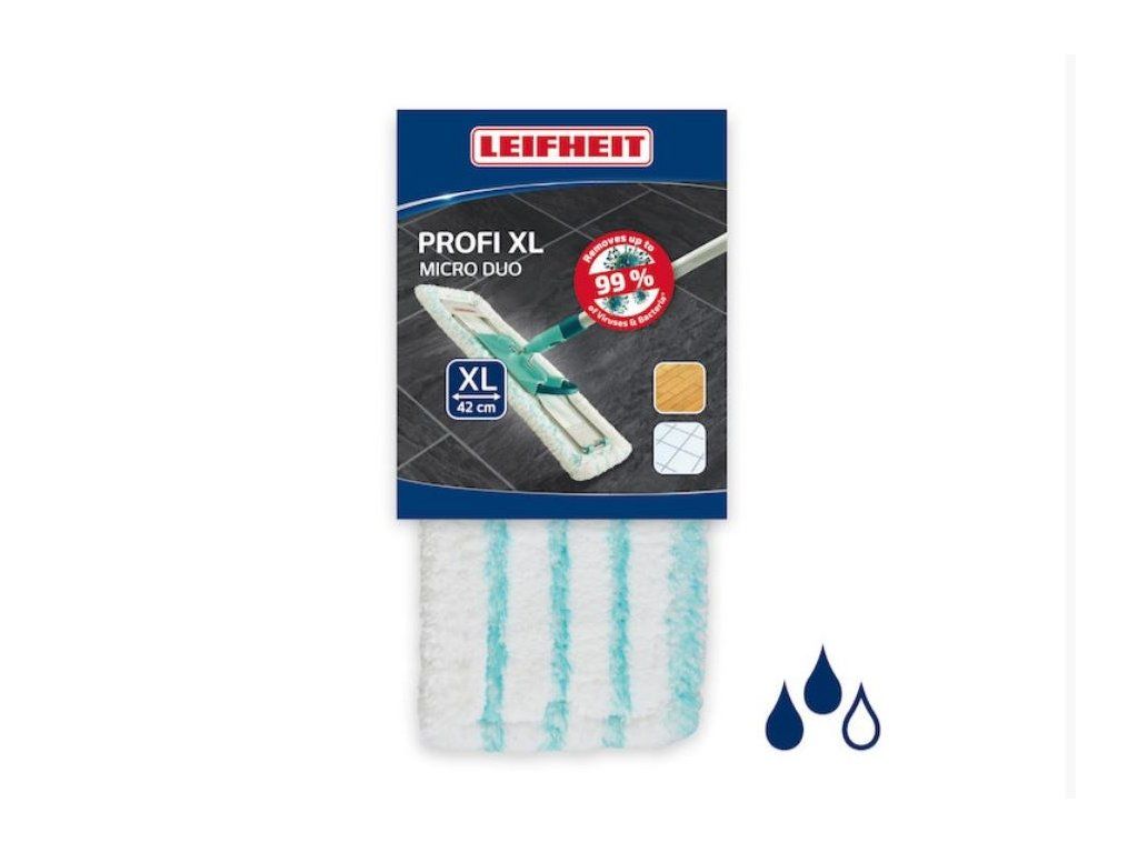 Leifheit náhradní návlek na mop PROFI Micro duo je **nezbytným doplňkem pro váš systém Leifheit Podlahový mop PROFI**, který zaručí vždy dokonale čisté podlahy s minimální námahou. Tento inovativní návlek je vyroben z vysoce kvalitních **vláken micro duo**, což je unikátní kombinace tisíců jemných mikrovláken a speciálních, mírně vystouplých štětin. Tato dvojitá struktura zajišťuje mimořádně efektivní odstranění i odolných nečistot, zaschlé špíny, mastnoty a prachu z **jakéhokoli typu podlahy** – od dlažby a vinylu až po laminát a dřevo.