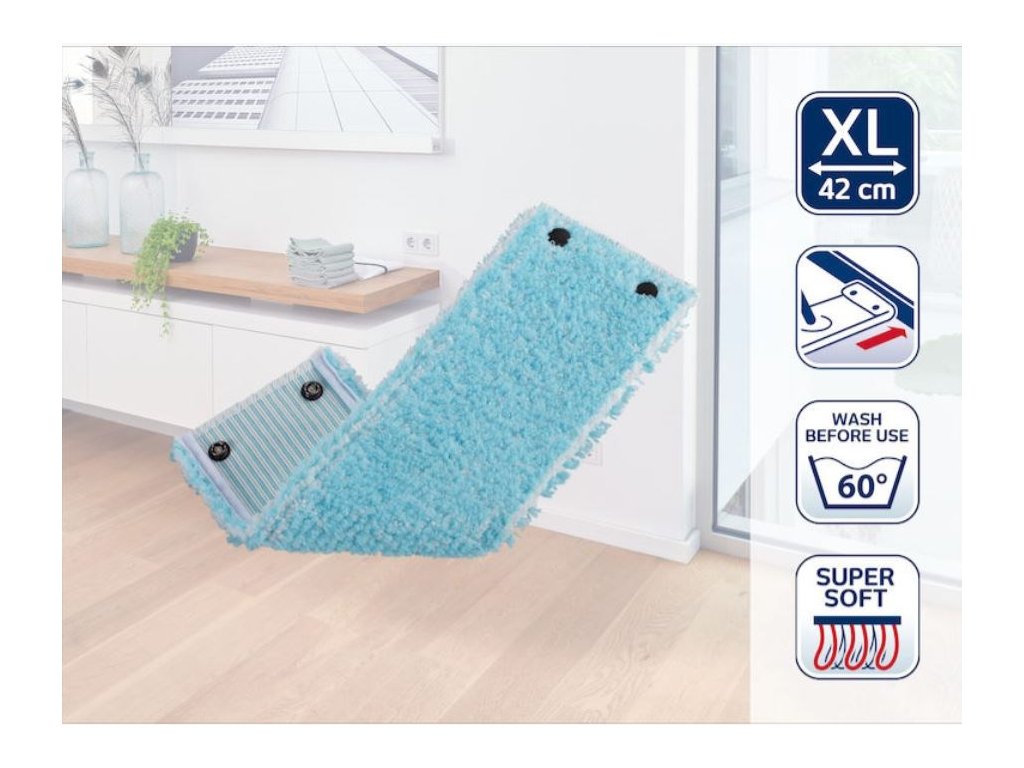 Náhrada Sensitive k mopu Twist XL značky Leifheit. - vhodné na vytírání všech typů podlah (lino, parkety, lamino, korek, dřevo) - speciální mikrovlákno výborně zachycuje všechny nečistoty - nevytváří žmolky - rychle osychá - garantuje dlouhou životnost - spolehlivé přichycení na patentky - možno prát v pračce bez aviváže - rozměr: 50 x 14 x 2 cm - šířka záběru 42 cm - náhrada k mopu je určena na mopy se šíří záběru 42 cm (52015) - hmotnost 45 gDoplňkové parametry