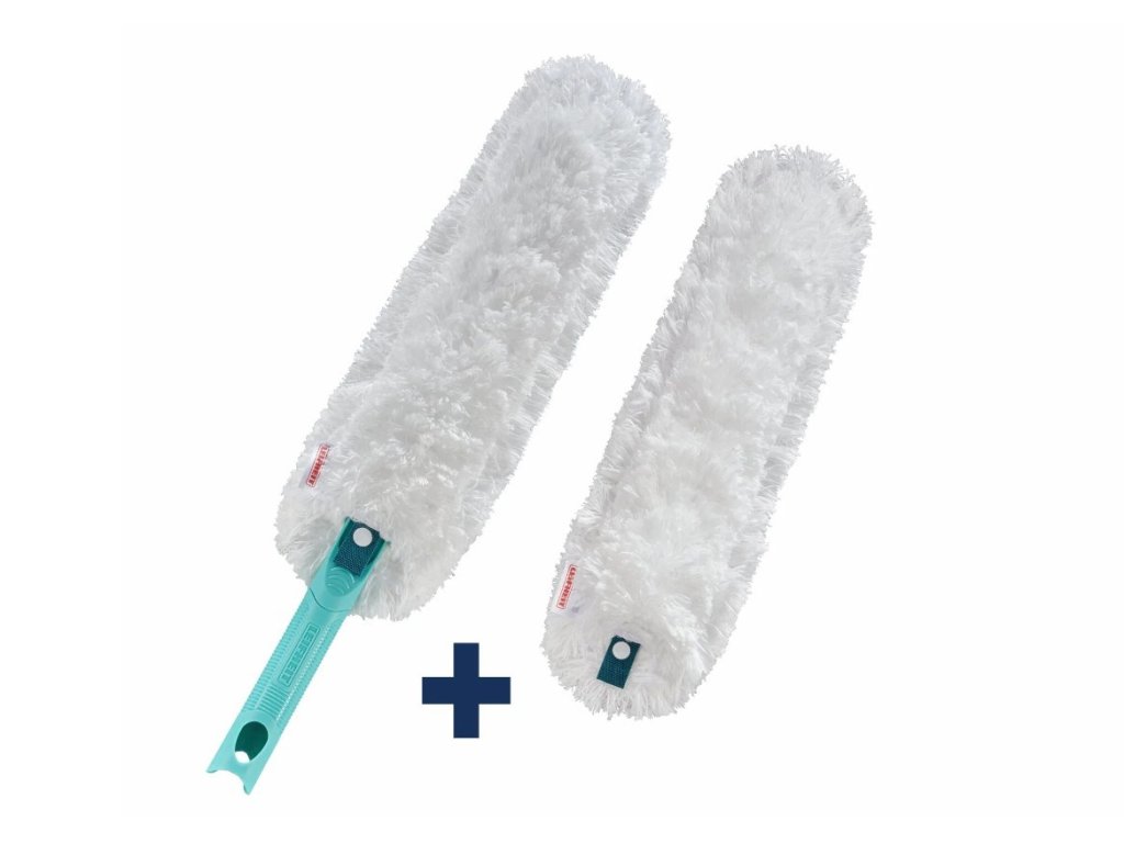 Tato výhodná sada obsahuje kromě samotné prachovky také **jeden náhradní návlek navíc**. To vám umožní prachovku používat, i když je jeden návlek právě v pračce, nebo můžete jeden návlek vyhradit na hrubší úklid a druhý na jemnou elektroniku. Prachovka je vybavena praktickým systémem **Leifheit Click System**, díky kterému ji můžete během vteřiny nasadit na libovolnou teleskopickou násadu Leifheit. To vám umožní bezpečně odstranit pavučiny a prach i z vysokých stropů, garnýží nebo horních ploch skříní bez použití žebříku.
