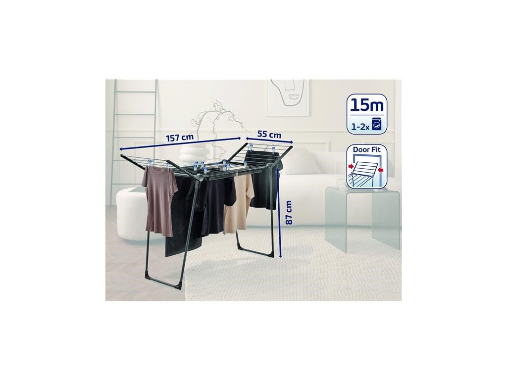 - Slim design (šířka 55 cm): Unikátní rozměr, díky kterému sušák projde dveřmi i v plně rozloženém stavu.