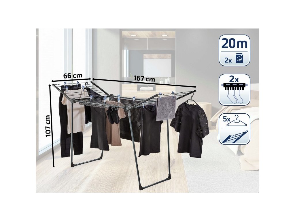 - Praktická výška křídel: Bočnice ve výšce 107 cm umožňují sušení dlouhých kusů prádla bez kontaktu s podlahou.