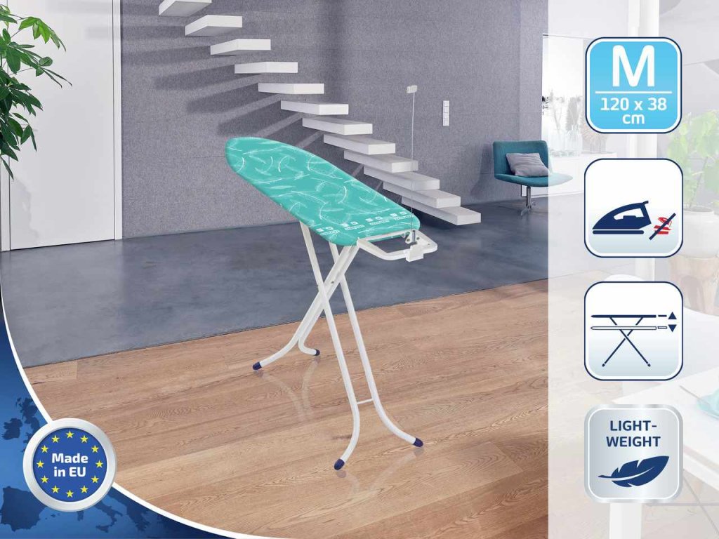 - Kompaktní rozměry: Žehlicí plocha 120 x 38 cm je ideální pro menší až střední domácnosti.