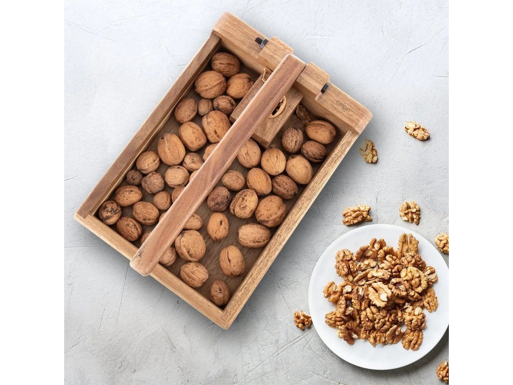 Tento louskáček je navržen tak, aby umožnil snadné a efektivní louskání vlašských a lískových ořechů. (Nelze jej využívat na jiné tvrdé ořechy nebo mandle. Poškození při používání tvrdých ořechů není důvodem k reklamaci, pokud se louskáček poškodí). Ořech umístíte do důlku a několikrát jemně přitlačíte páku. Pozor, při louskání stačí např. 3x jemně zatlačit a ořech se rozlouskne. (Používejte jen přiměřenou sílu, aby se louskáček nepoškodil). Díky jednoduchému pákovému systému je louskání rychlé, bezpečné a nevyžaduje velkou sílu. Výhodou je možnost louskání většího množství ořechů přímo do boxu a poté postupné vylupování jader ze skořápek. Materiál: akáciové dřevo, kov. Rozměry: 25x18x4,5/10 cm. Není vhodný do myčky.Doplňkové parametry