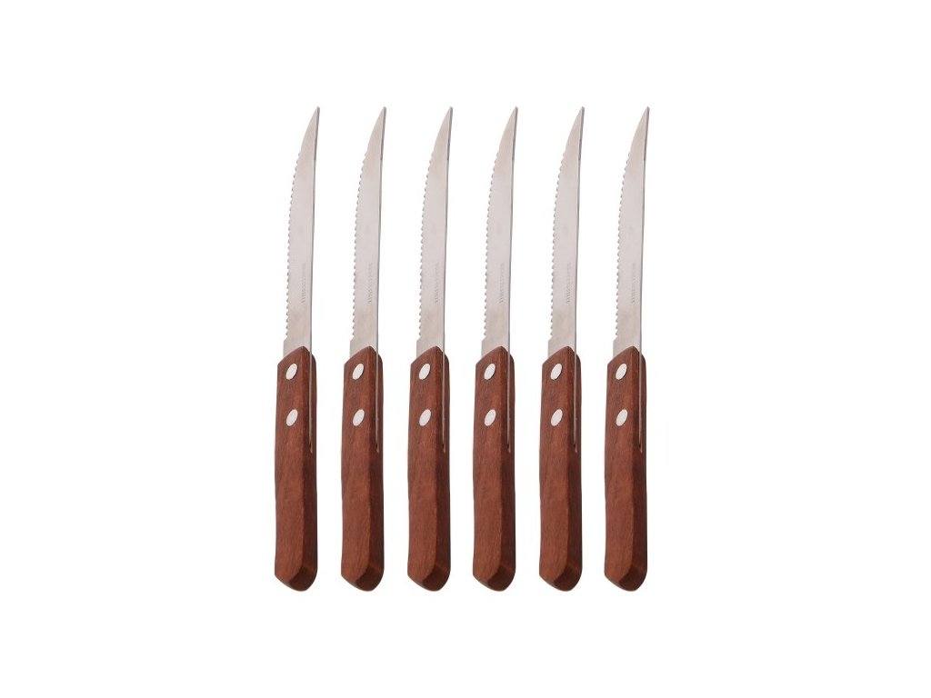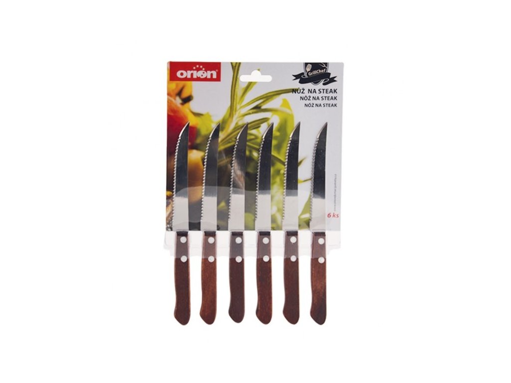 Steakový nůž se zubatým ostřím si hravě poradí nejen s grilovaným masem. Využijete jej především při venkovním grilování, kde v kombinaci se steakovými vidličkami udělá dobrou službu a šťavnaté, dobře propečené pochoutky z grilu budete moci pohodlně jíst. Ale i pro běžné, každodenní stravování nebo rodinnou večeři, třeba s vysokými hovězími steaky na pepřové omáčce, se dobře osvědčí. Díky příjemné dřevěné rukojeti, zpevněné nýty, se budou dobře držet. Lze je umývat běžným způsobem, v teplé vodě se saponátem. Vlastnosti produktu Materiál: nerezová ocel, dřevo Délka (cm): 20,5 Hmotnost (g): 137 Použití: na steak, na grilování Vlastnosti: nůž Vhodné do myčky: ne Pro děti: neDoplňkové parametry