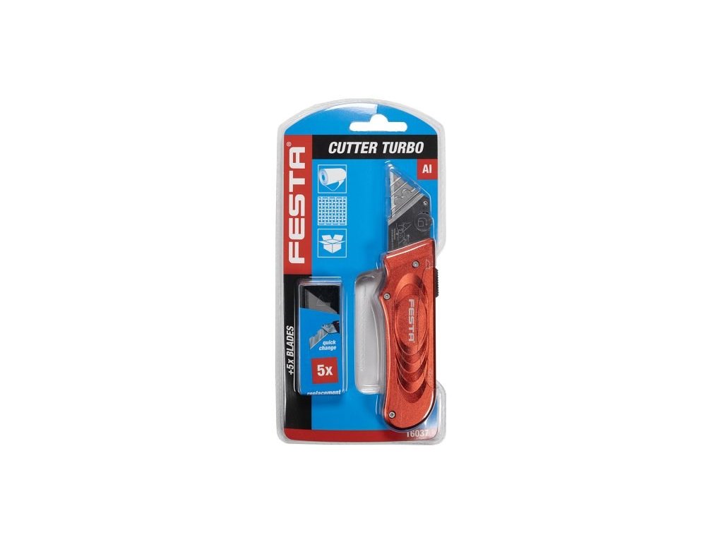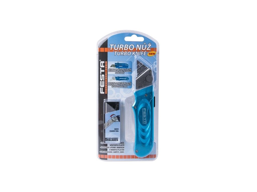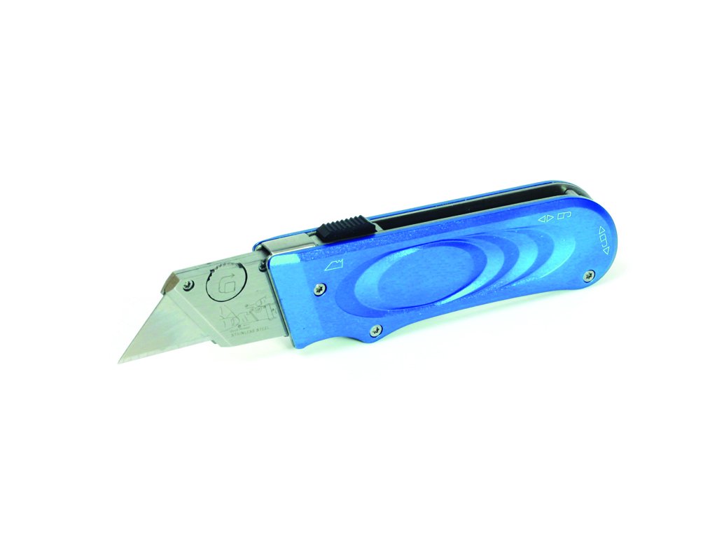 Profesionální celokovový nůž, výsuvná lichoběžníková čepel s aretačním tlačítkem, klip na opasek, 5 náhradních čepelí.