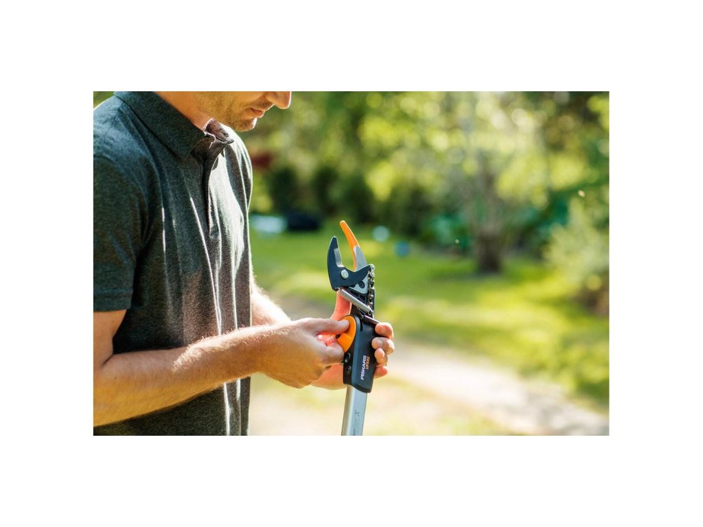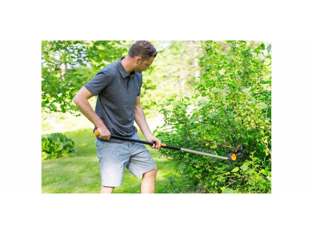 Zahradní univerzální nůžky Fiskars představují víceúčelové nástroje s vynikajícím dosahem do korun stromů a hustých keřů. Můžete s nimi stříhat ve výškách bez potřeby žebříku nebo naopak těsně u země, aniž byste se museli ohýbat či klečet. Stříhat lze dvěma způsoby – buď zatažením za oranžovou posuvku nebo za oranžovou část na konci násady.