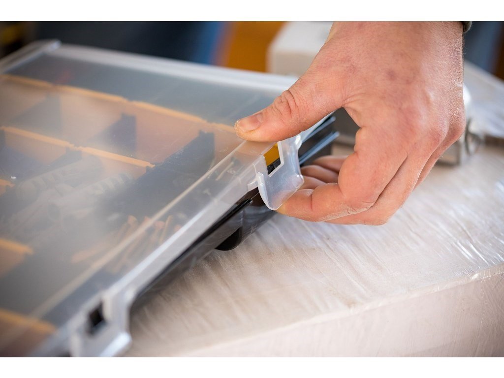 STANLEY 14" organizer s 22 přihrádkami Plastová konstrukce s transparentním víkem Vyjímatelné přihrádky Zavřené víko uzamyká přihrádky a chrání jejich obsah před vysypáním Na víku vyznačená stupnice v centimetrech a palcích Technické parametry: 22 přihrádekDoplňkové parametry
