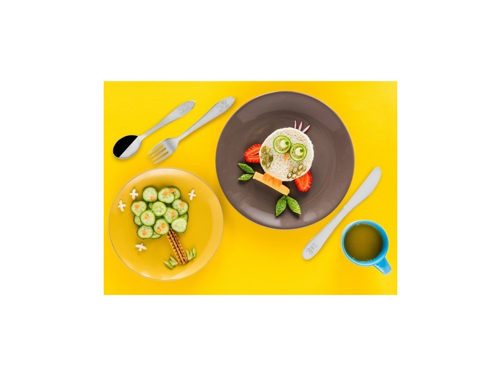 - Kompletní základní sada: Obsahuje lžíci, vidličku a nůž v jednotném hravém designu.
