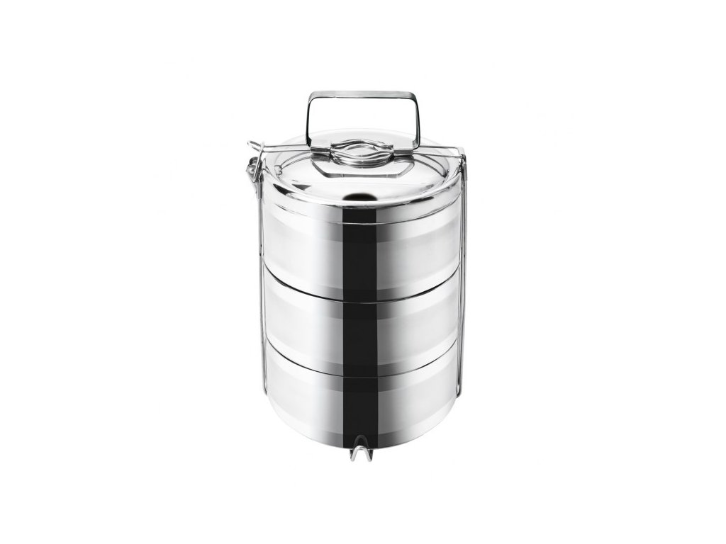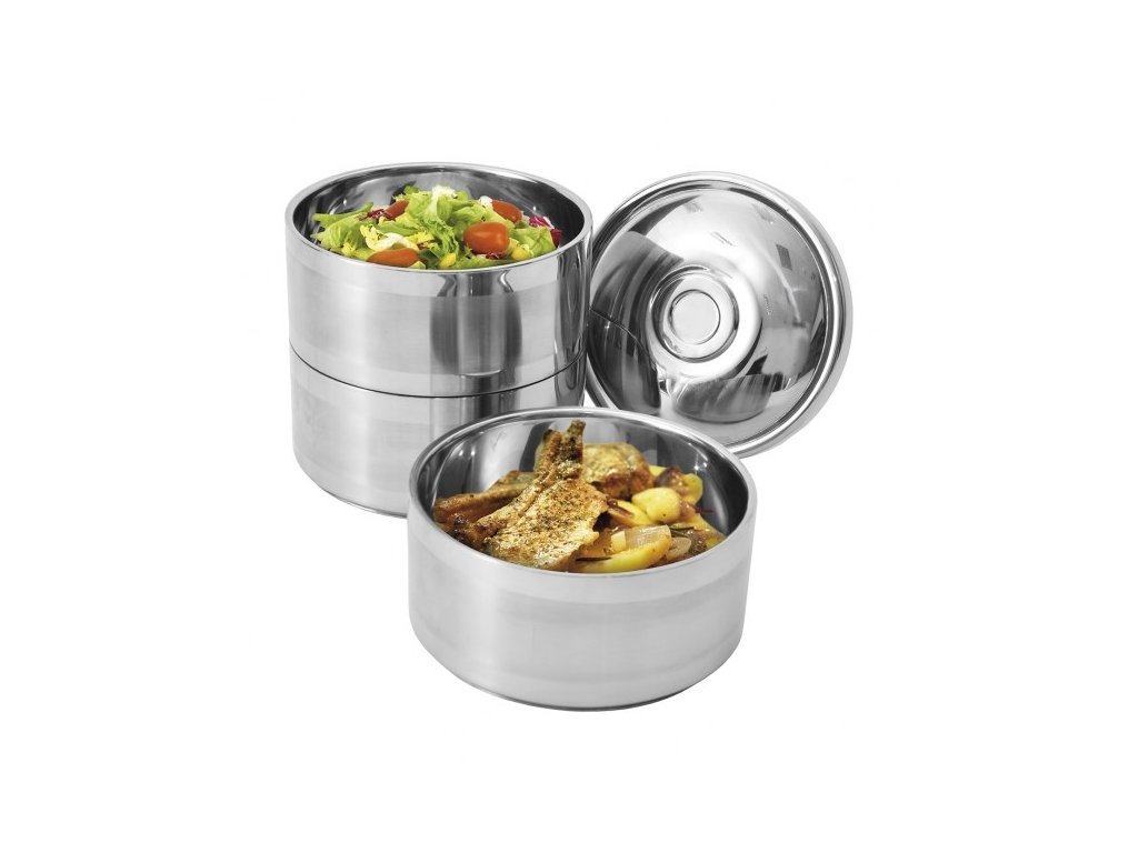 Celý set je vyroben z prvotřídní **nerezové oceli**, která zaručuje maximální hygienu, dlouhou životnost a odolnost proti mechanickému poškození. Nerezový materiál nepřejímá pachy ani chutě, což je zásadní pro zachování kvality potravin. Misky do sebe precizně zapadají a horní nádoba je opatřena víkem. Celá sestava je pevně sepnuta **kovovým stojanem** s bezpečnostní pojistkou a ergonomickým madlem, které usnadňuje přenášení i plně naloženého jídlonosiče.
