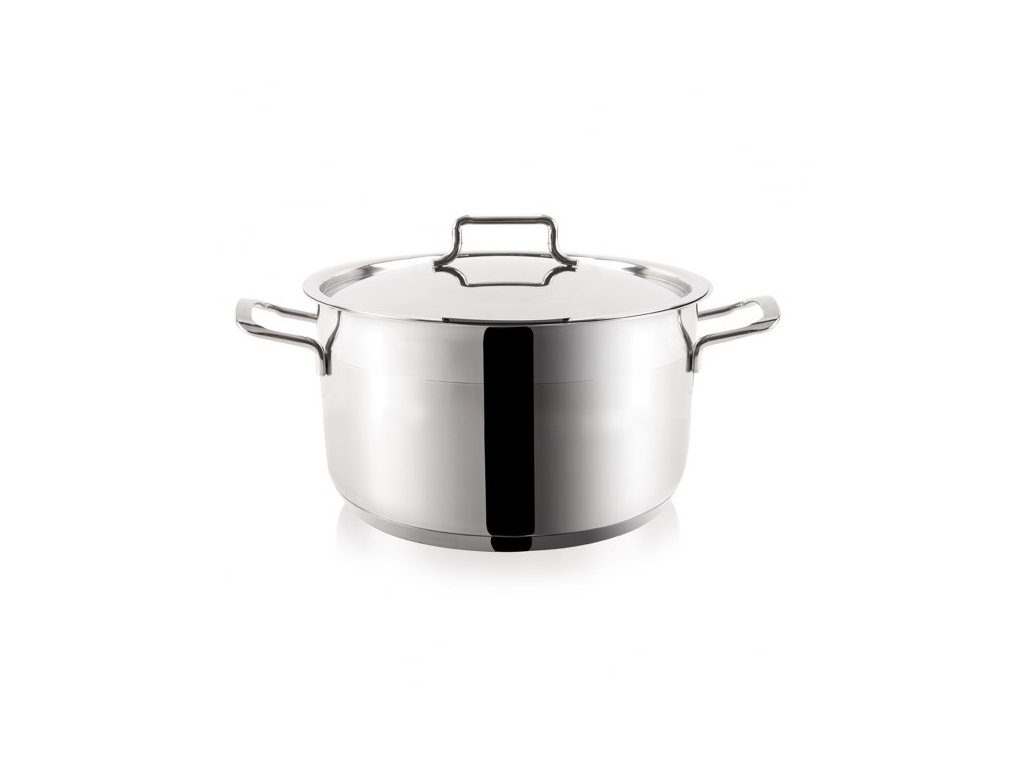 Kastrol je vyroben z odolné nerezové oceli a opatřen **silným sendvičovým dnem**, které zajišťuje rychlý a rovnoměrný rozvod tepla po celé ploše, což je klíčové pro efektivní vaření takto velkého objemu a minimalizaci připálení. Součástí je i praktická poklice, která spolehlivě udrží teplo uvnitř a urychlí proces vaření. Kastrol je plně kompatibilní se všemi typy varných desek, včetně indukce.